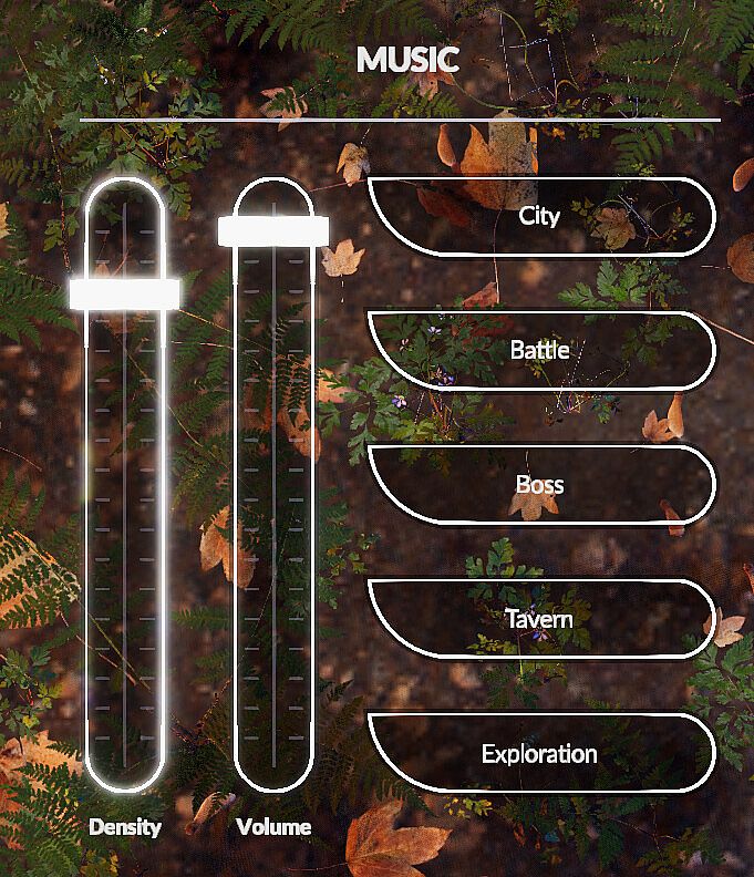 This project’s grand differential is the possibility to control the density of each musical theme, allowing that the immersion provided by the musical tracks don’t lose themselves but also adapt to each narrator’s style. Using the low density setting makes it not necessary to lower the volume of the music as it tends to overshadow the narration. At the same time, it is possible to reserve the high density settings to epic moments in the narration. The density control was developed through the manipulation of the quantity of instruments and the application of dynamic filters that allow the users a broad gama of immersion possibilities.