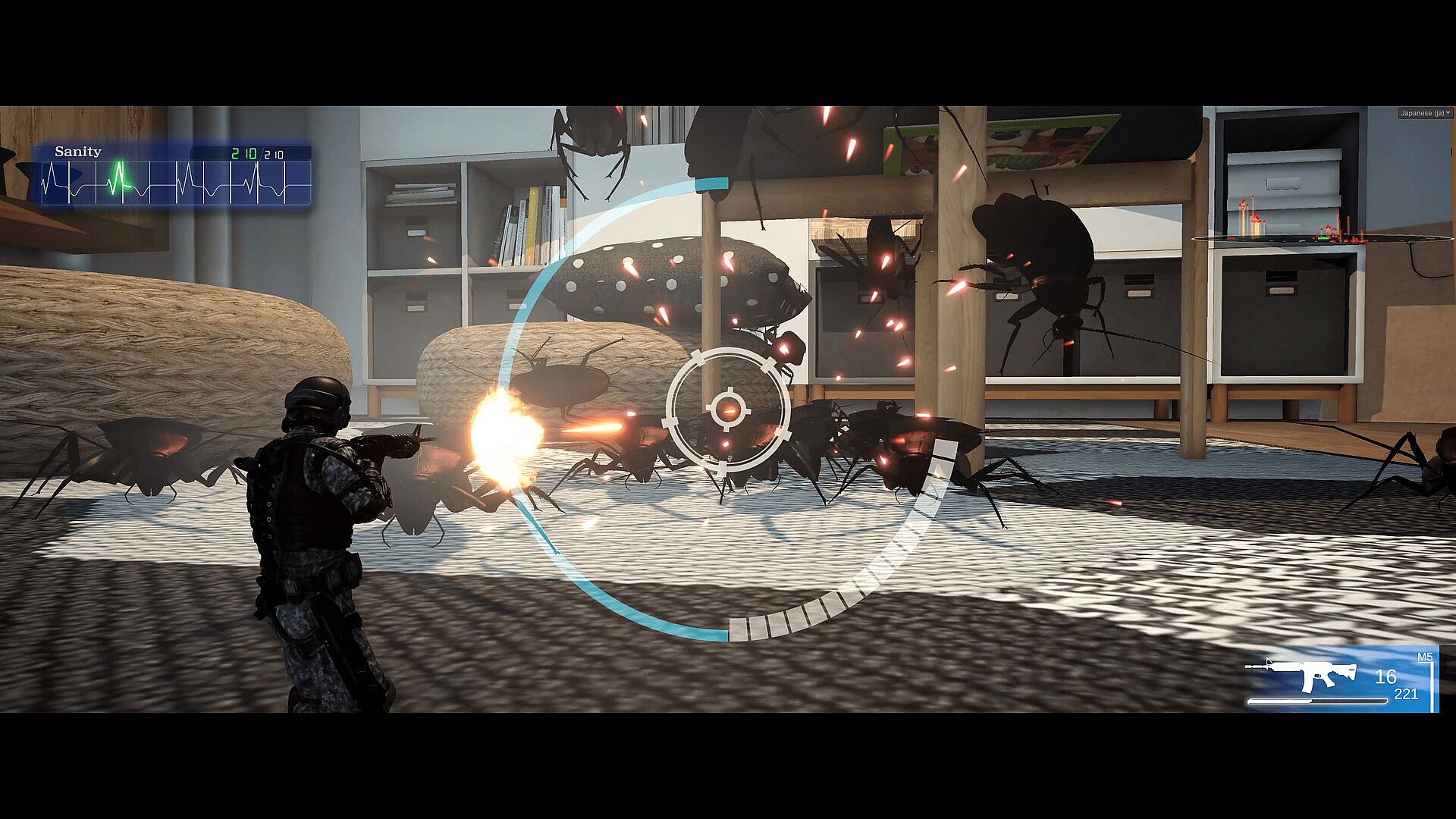 You are about the same size as a cockroach, and you must use every means at your disposal to destroy the massive number of "Gs" that crawl on the ground, on the walls, and even fall from the ceiling.