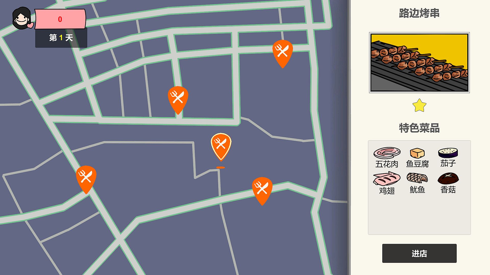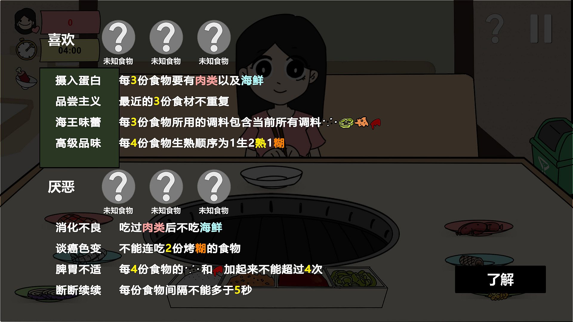 · The game is over after all restaurants have been tried and your girl friend will give you an evaluation based on the total favorability score.