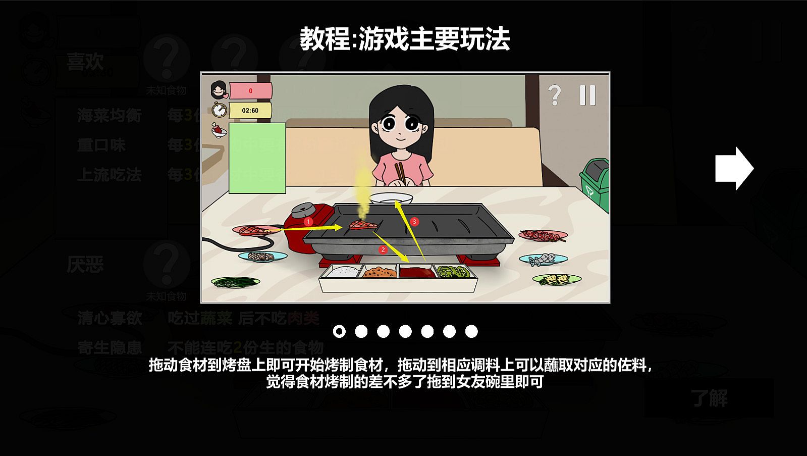 · The core mechanism of the game is to roast different ingredients to feed your girl friend according to her preferences, so as to increase her favorability score.· You can take her to one restaurant a day and her preferences will change in different restaurants.