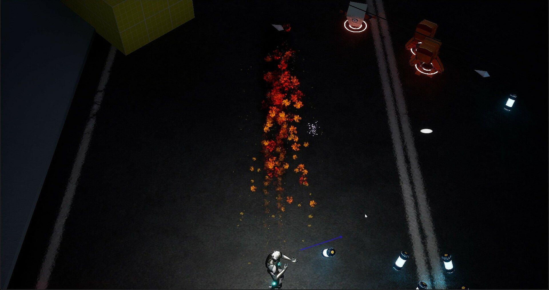 Napalm boots material and flame trail, napalm damages enemies, auto fire toggle for primary ability, time freezes for boss battle, boss countdown, visual effects (pickup for experience and health, firework, level up, ring around player, floating cross), health booster functionality and model, visual indicator for the enemy range, enemy red light pulse to indicate seeking or angry mode, post-match summary screen, pause menu functionality, kill counter