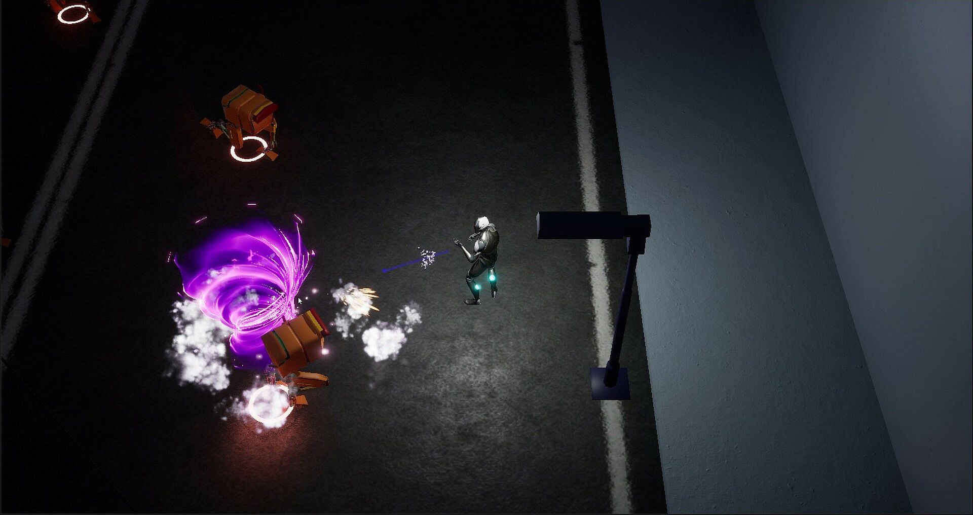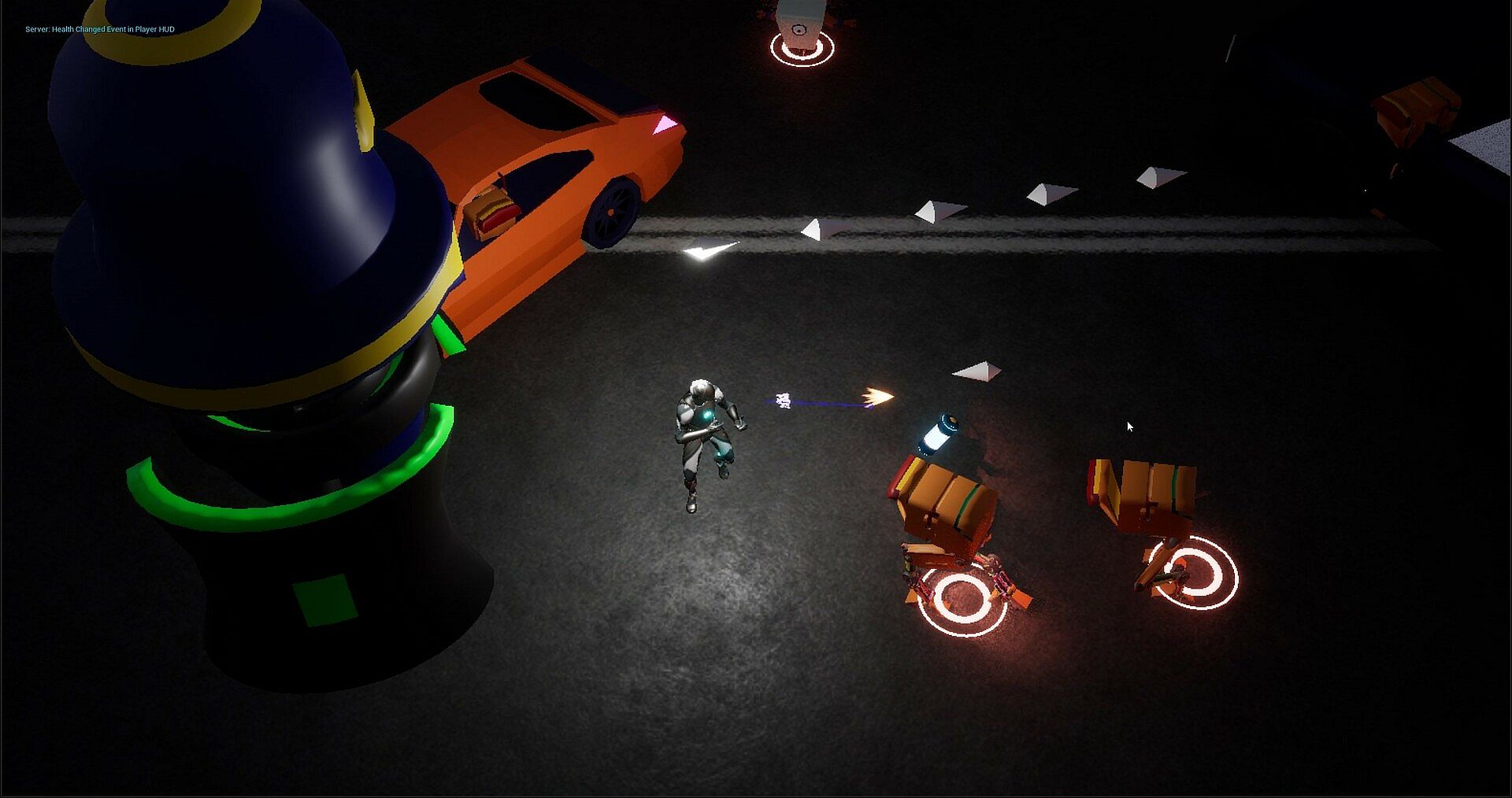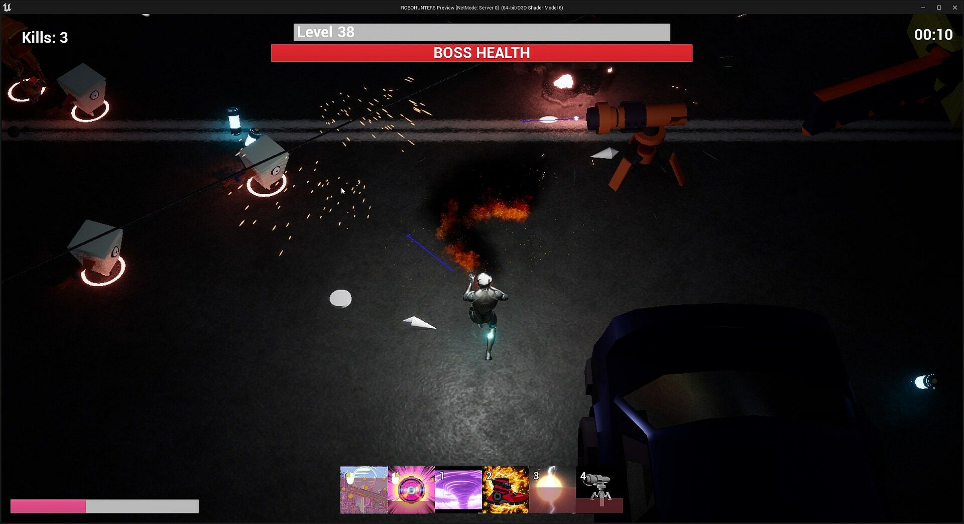 Project lead, core gameplay, enemy and boss AI, player movement, main gameplay UI elements, main menu, health system, sounds (abilities cooldown and laser), particle effect for plasma rifle, turrets, main enemy spawner, enemy damage, trash robot animations and integration, experience pickup model and emissive shader, player level and skill selection, concept art, styled menus, night map, visual effects and sound effects for abilities and environment, gameplay balancing, additional sound cues, level design (including lighting and environment decoration), assorted bug fixes