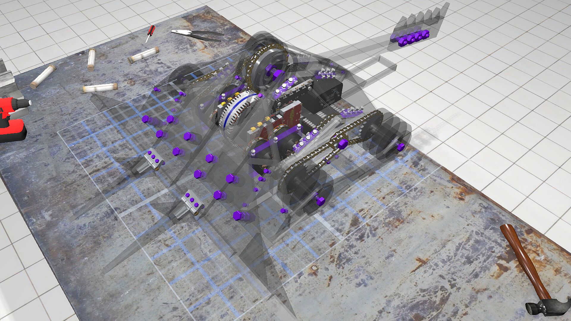 - Construct your robot with basic parts and custom shapes, all fully simulated using a "welded/bolted connection strength" based damage model.