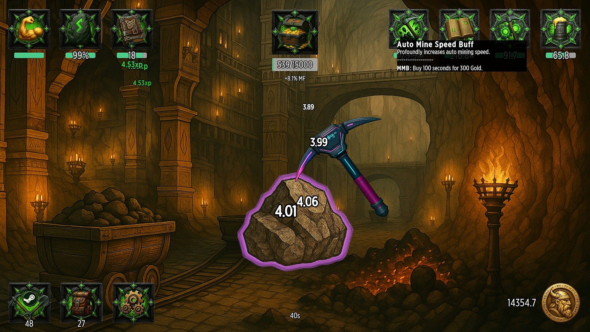 While mining, you have a chance to find gold and temporary buffs. You can also buy longer-lasting buffs with gold at any time. There are four types of buffs that can give you a boost, including: