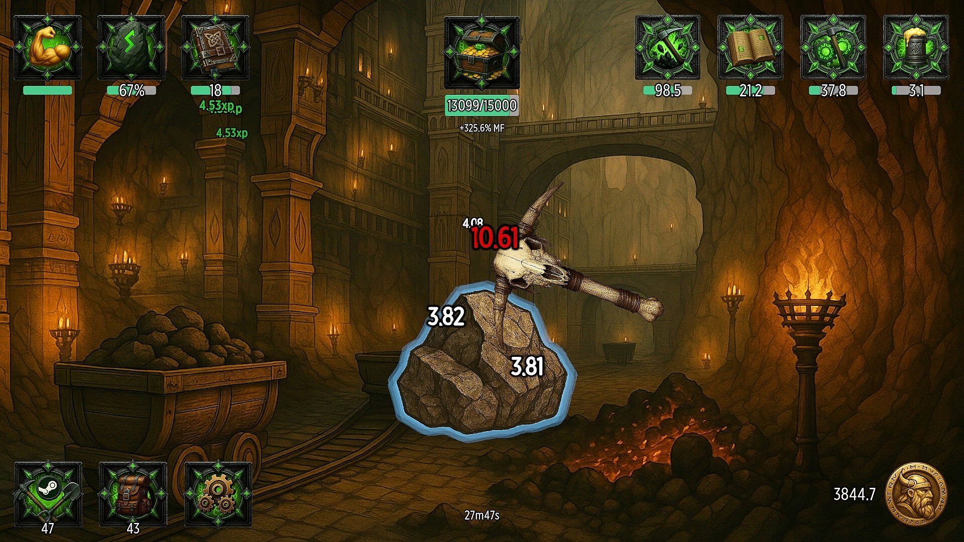 You can equip various types of gear, such as rocks, pickaxes, and pickaxe mods, to improve these stats and become an even more effective miner.