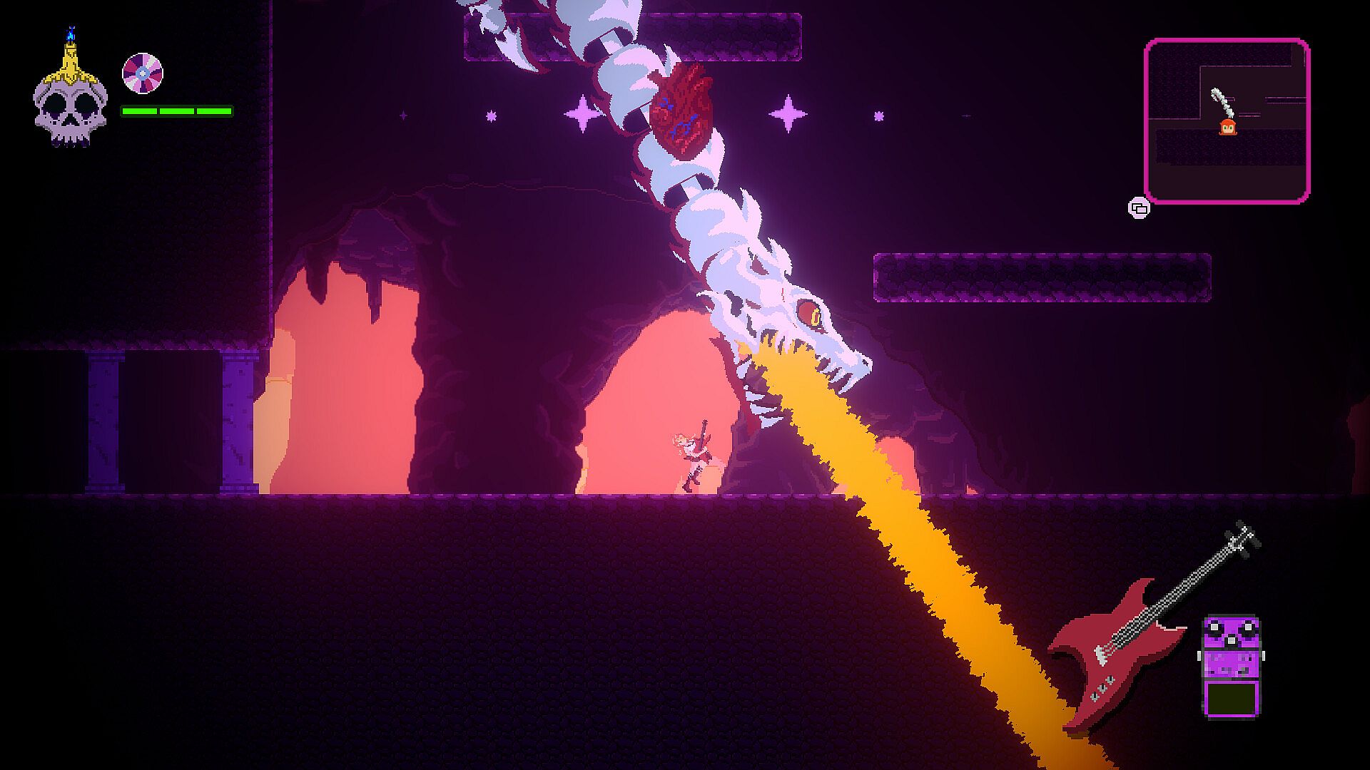 Rockin' Hell is a rhythm-based Metroidvania where you play as Victoria Riot, a rising rock star who, just before playing at the biggest concert in her career, dies and wakes up at the gates of the underworld.