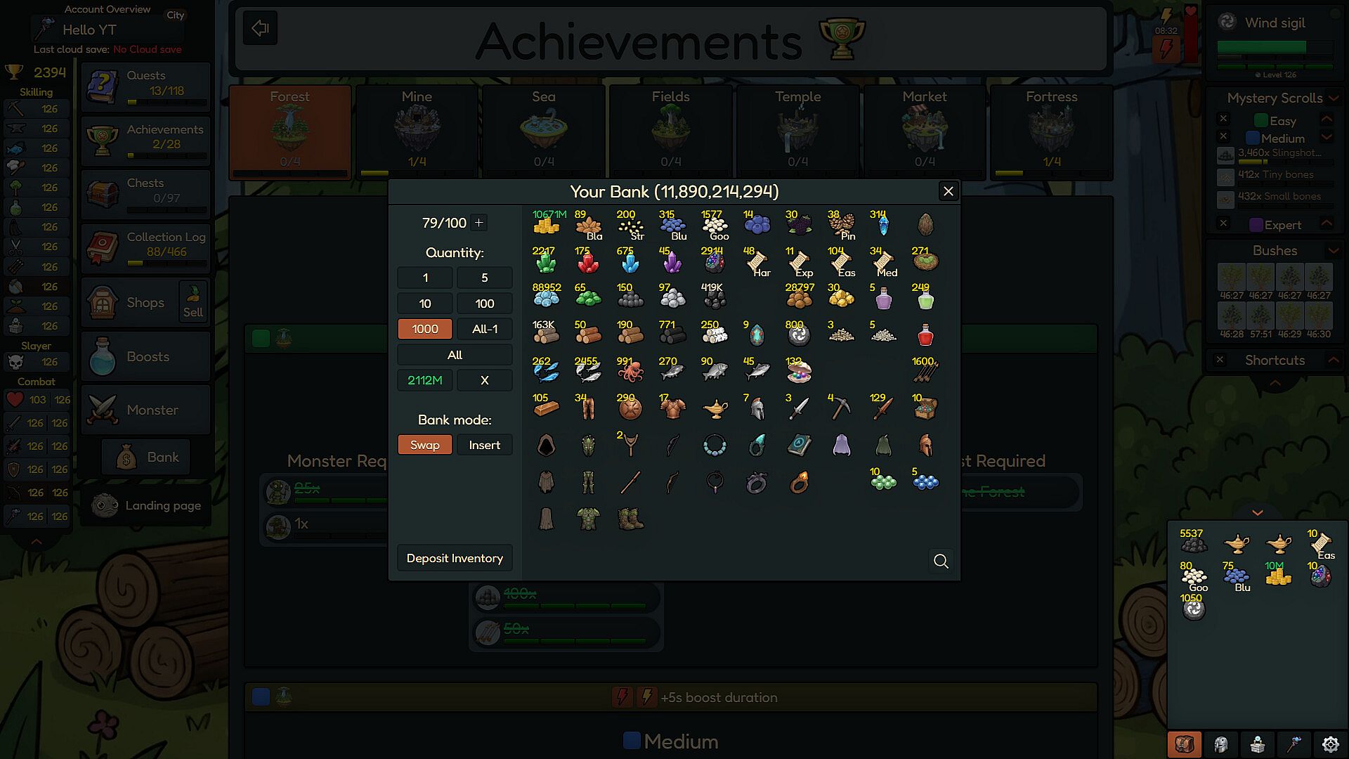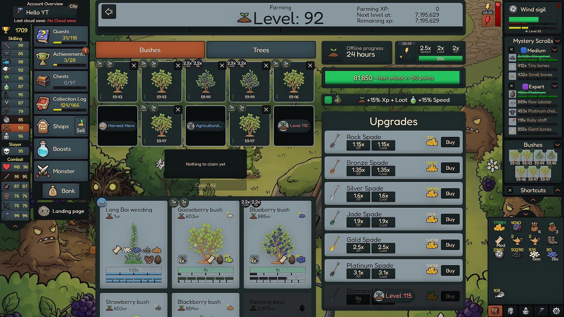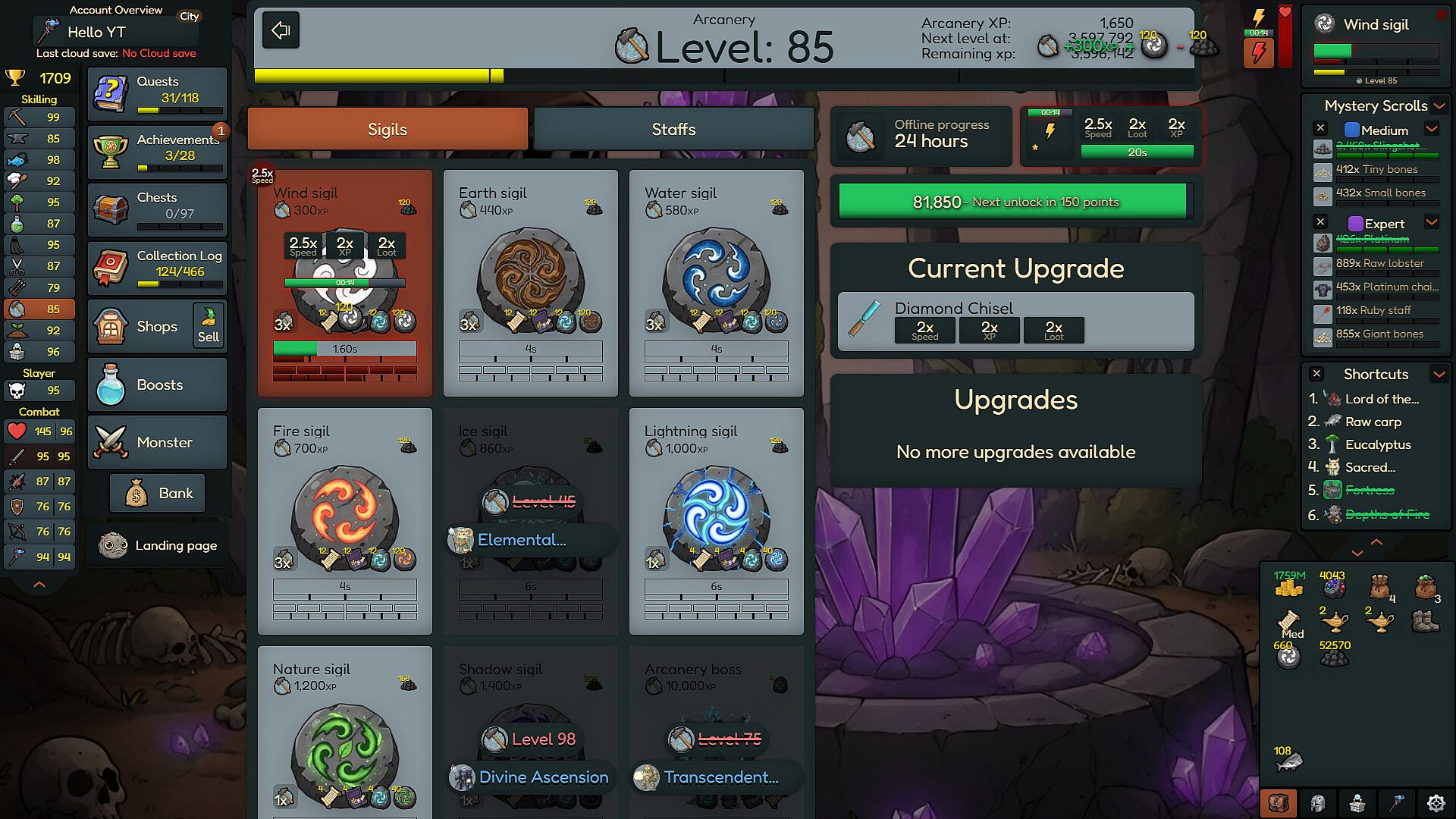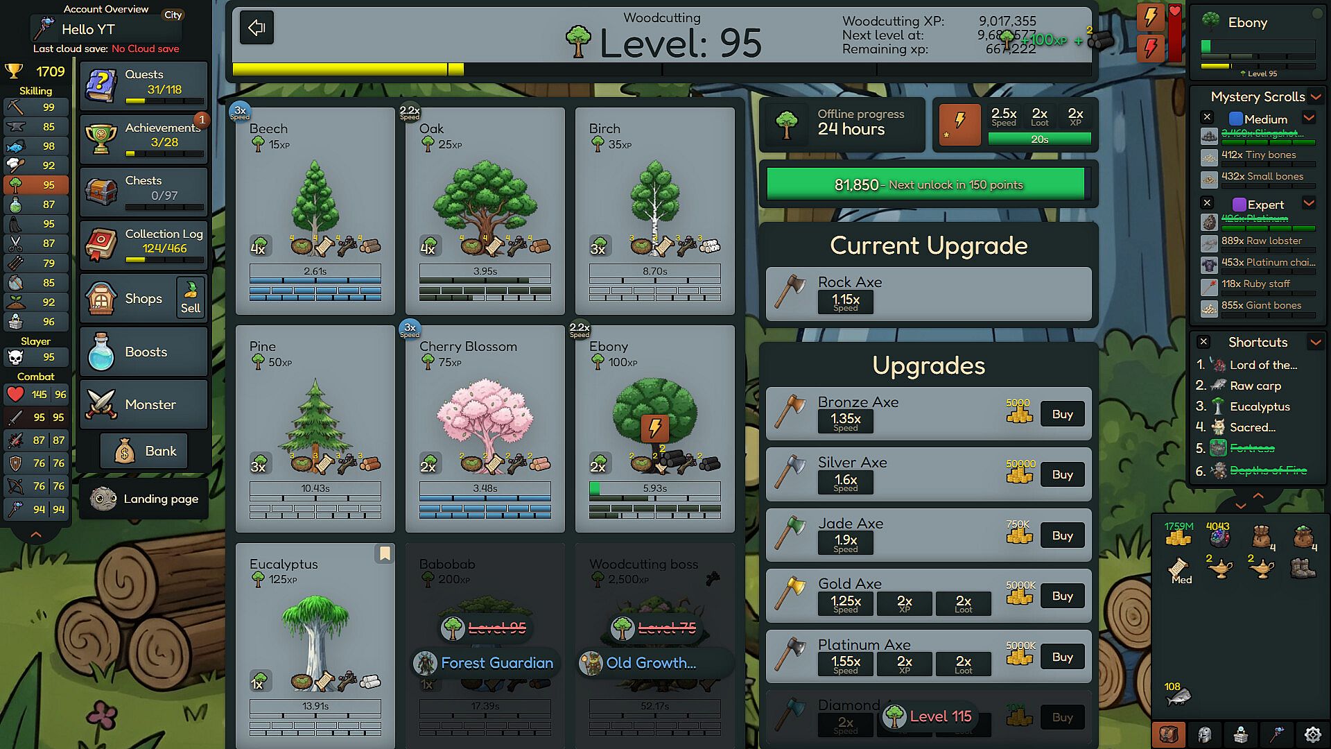 Rocky Idle is a single-player idle/incremental game. Level up your skills, gather resources, and craft powerful combat gear to defeat the strongest bosses and complete your collection log.
