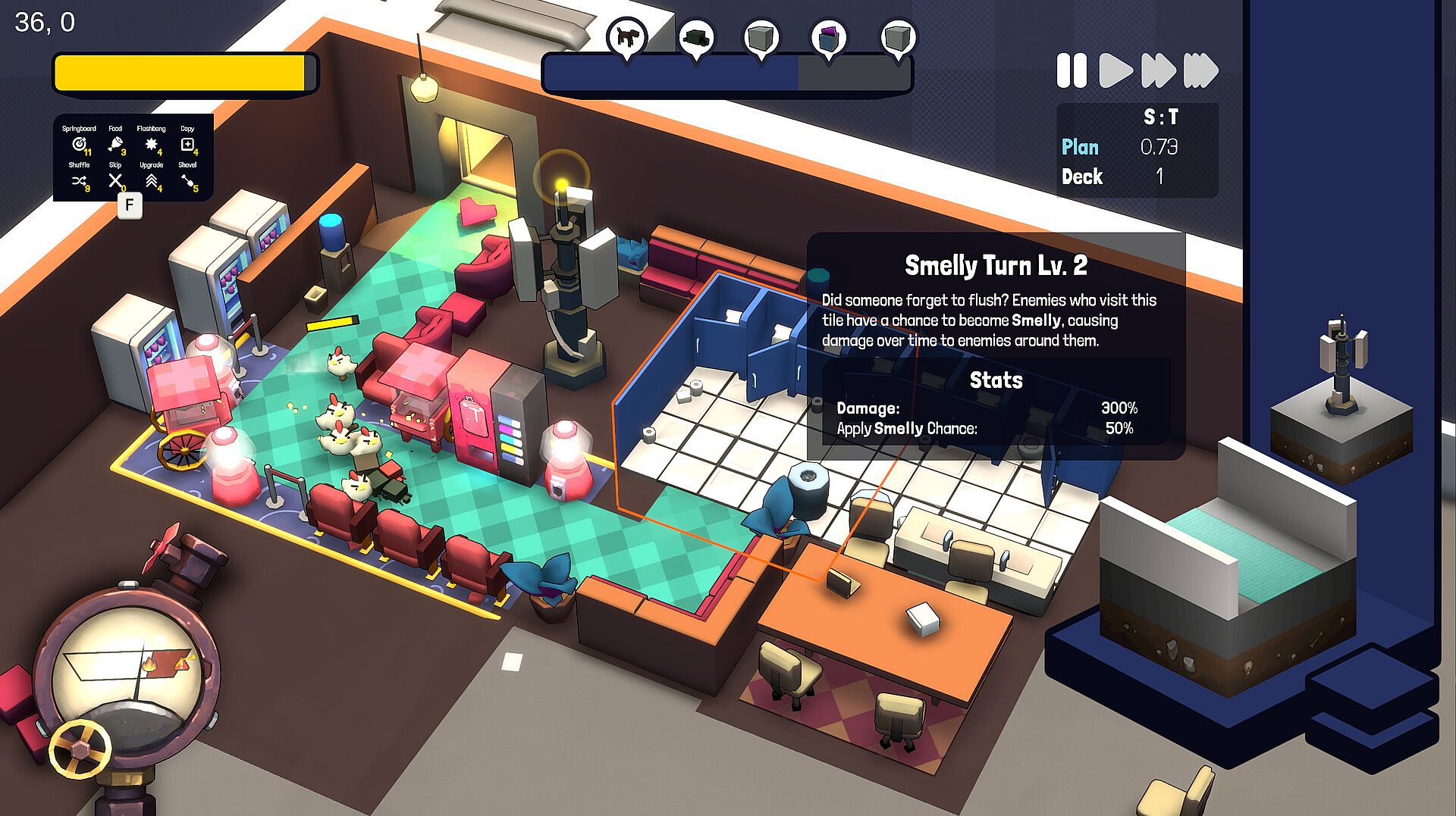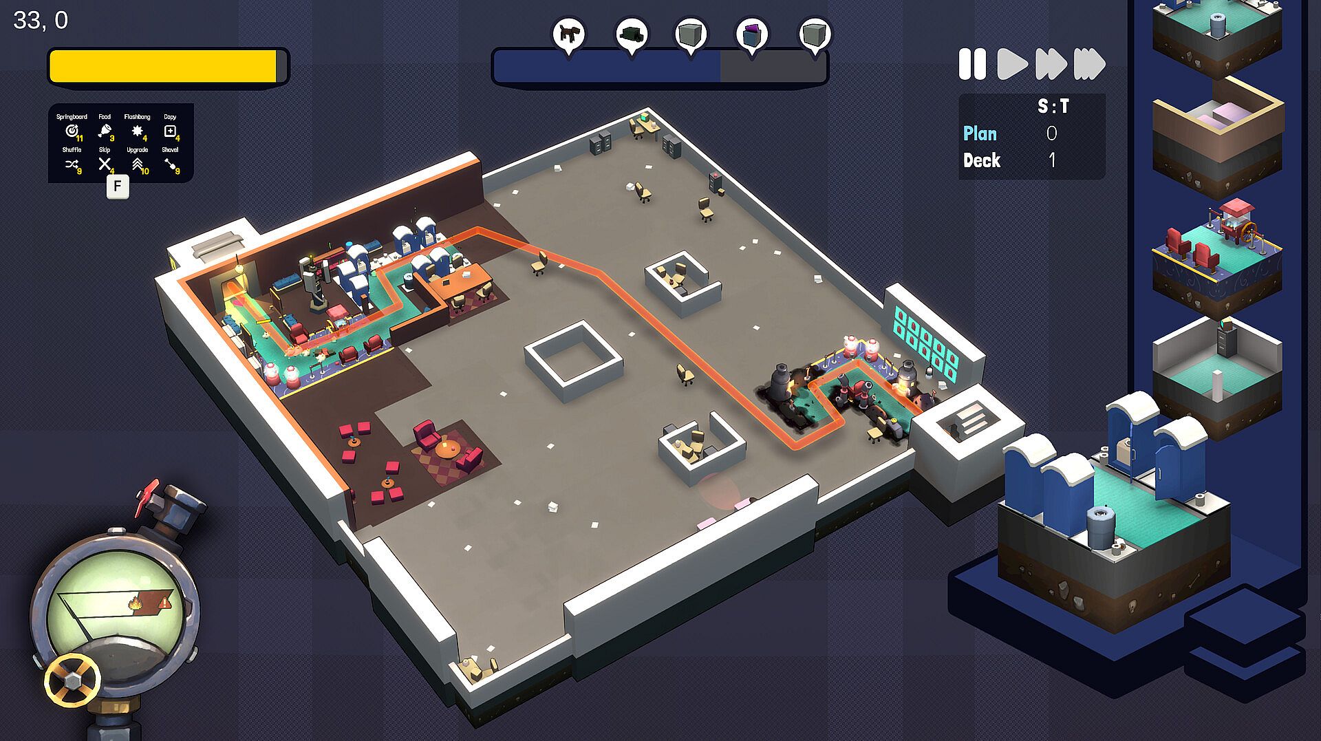 Troubled by a particularly pesky Rogue? Gadgets are conveniently located on each level to handle their insubordination. Deploy a giant springboard or offer free food to interrupt unwelcome activities and re-establish order.