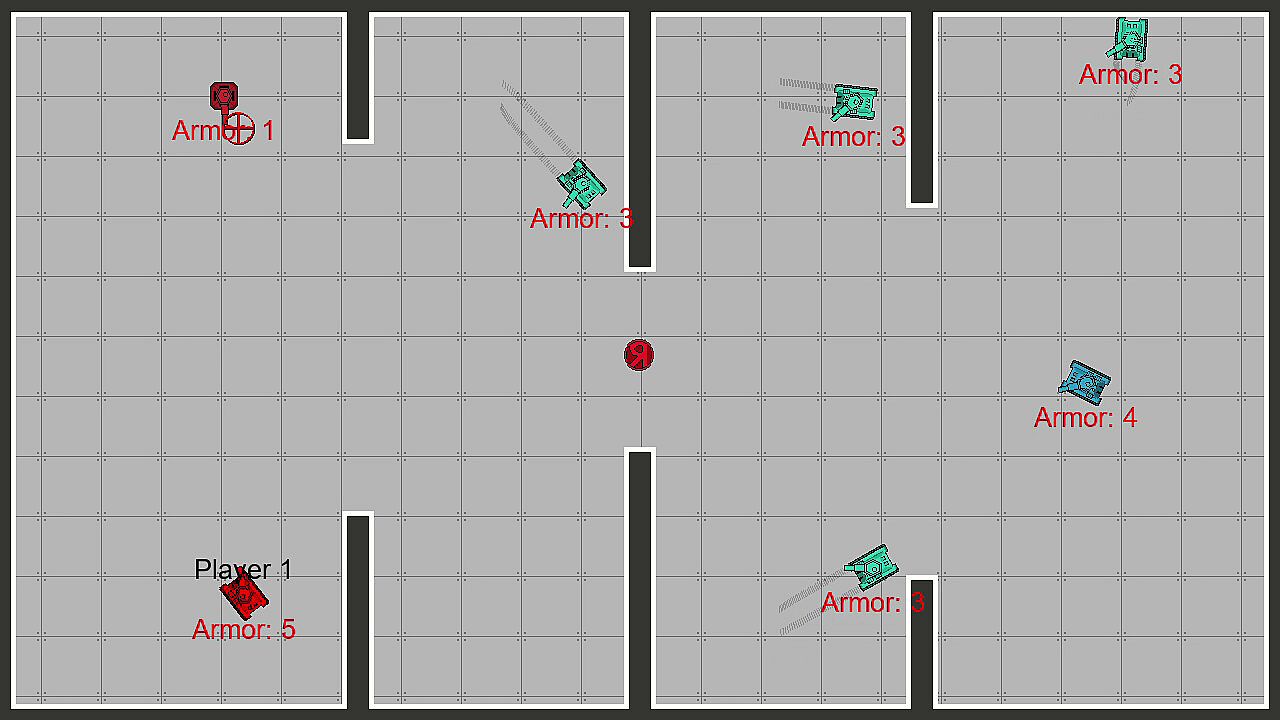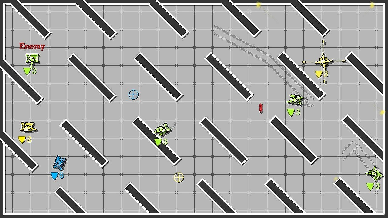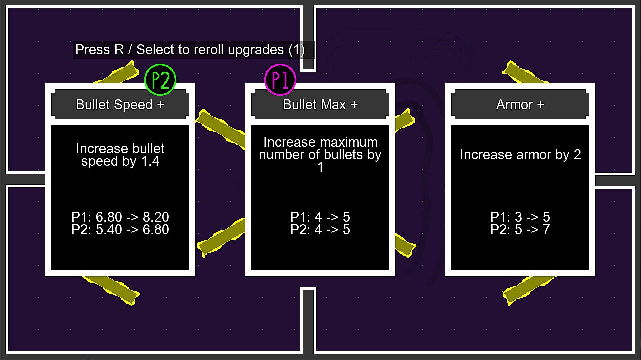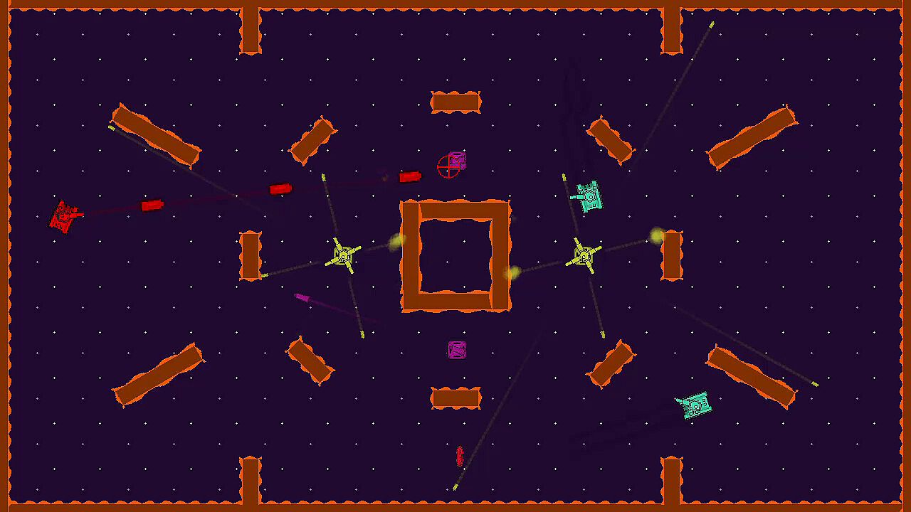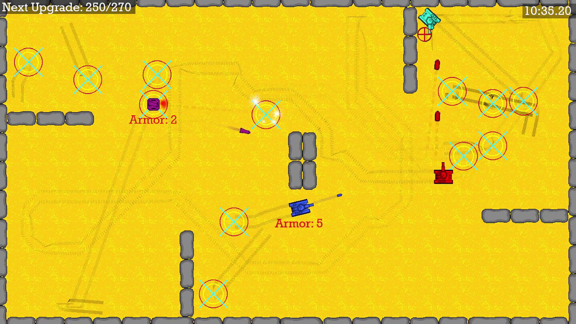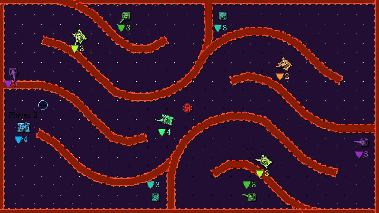 Battle your friends in versus mode for 2 to 4 players. Earn a point for each tank you defeat and pick an upgrade when you are defeated. Win by reaching a certain number of points or by having the most points at the end of the timer. Choose the number of points or time to end the match.