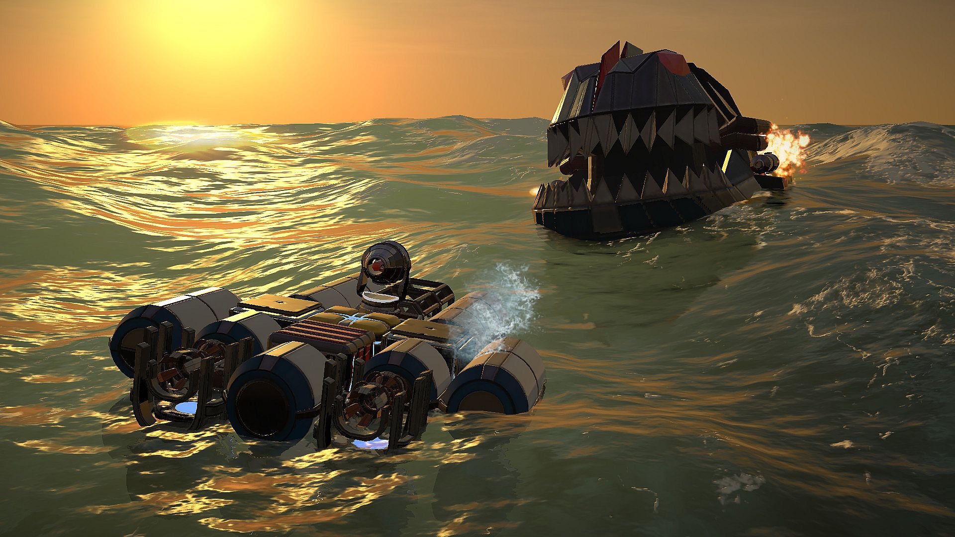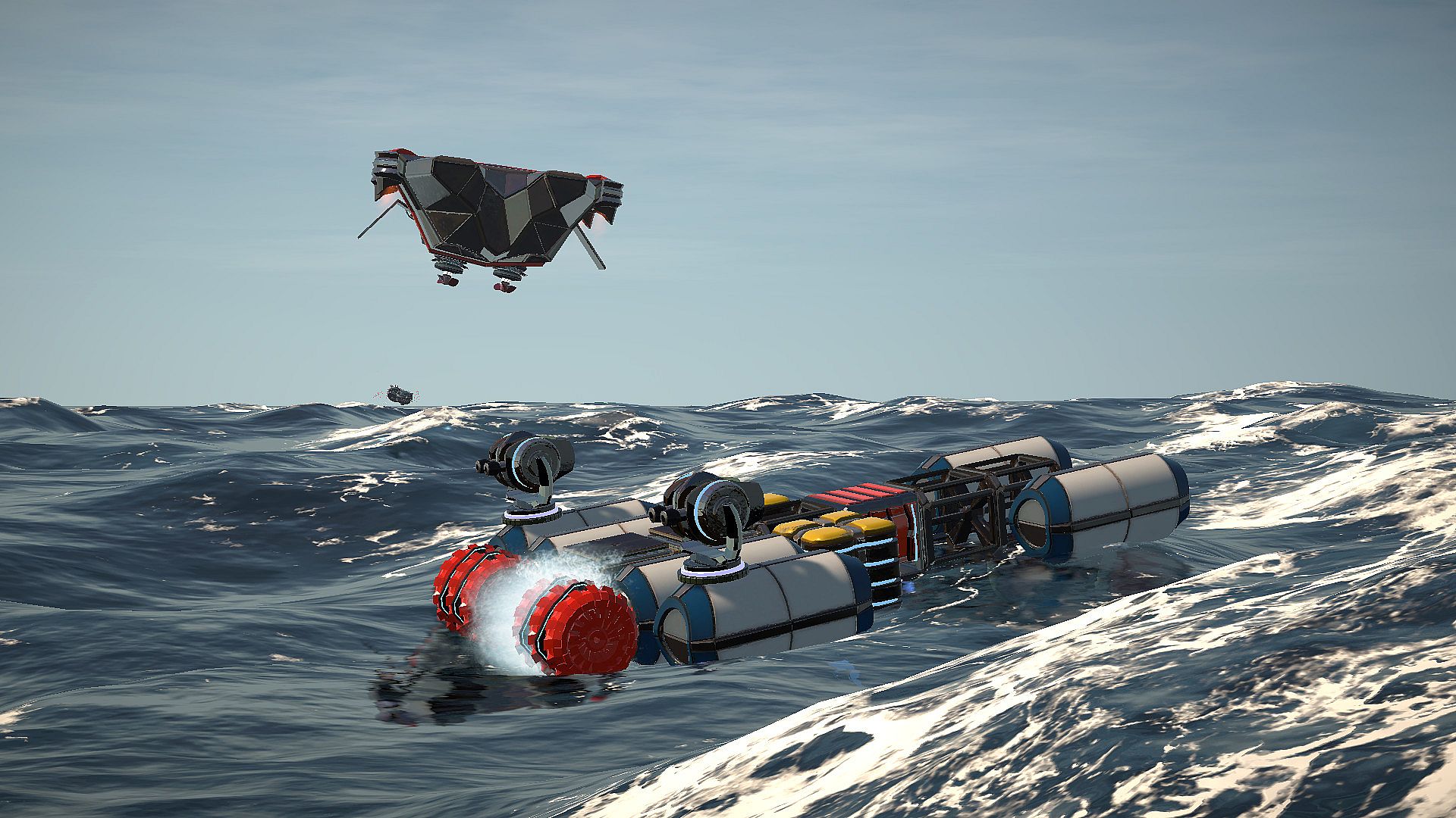 Build war ships in a physics-based simulation where every block affects buoyancy, stability, energy generation, and weaponry. Plan additions like floaters, propellers, rudders, solar panels, batteries, machine guns, and hydrofoils with care, unlocking more types as you advance through challenges. An immersive narrative unfolds around AI mechanoids surviving nuclear devastation and floods in a world of warring evolved machines. Story Mode follows a small AI entity uncovering relationships among wild mechanoids driven by survival, dominance, or chaos. Sandbox Mode unlocks all elements for unrestricted experimentation with time, weather, seas, creatures, and ship builds. Indie adventure fans who enjoy ship building and narrative discovery will find a focused loop here.