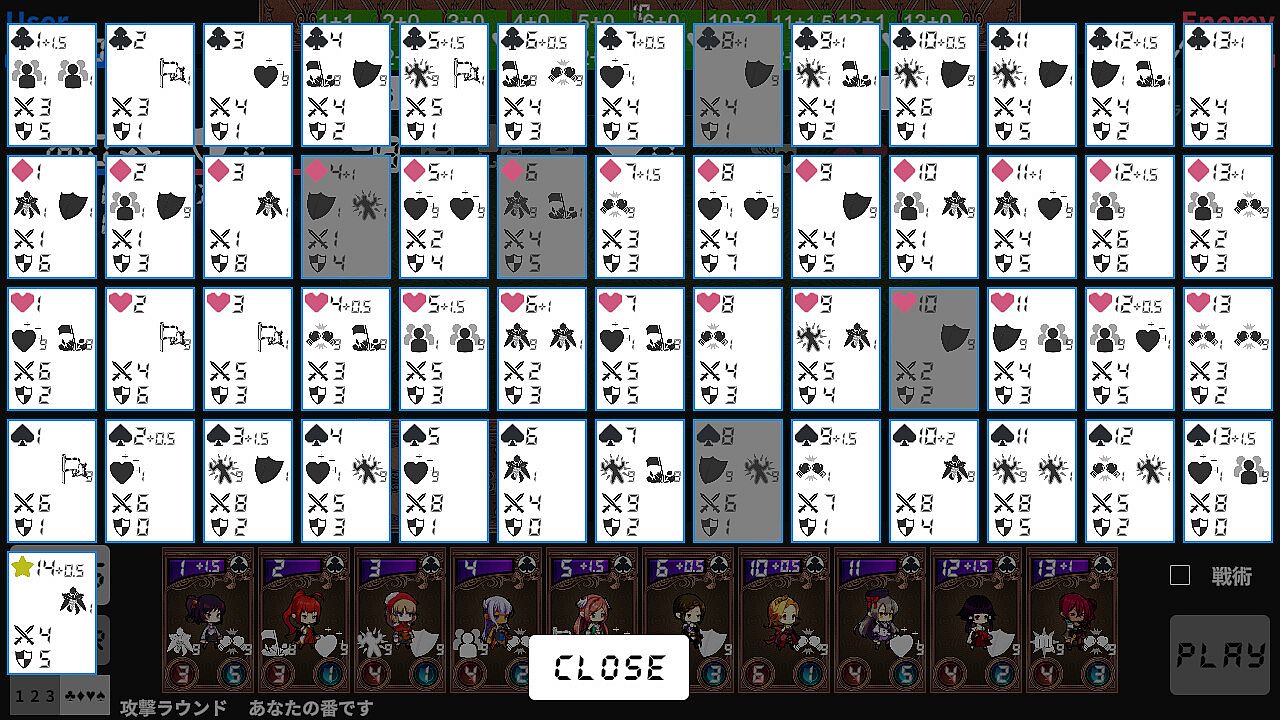 Each of the 53 cards, including one Joker, can grow. Not only do their attack and defense powers increase, but the values added to their original numbers also grow. For instance, a 3 card can become +2, +3, and so on, eventually becoming stronger than a 4 card. Increasing the card's number is a significant advantage in this game. Additionally, cards can acquire special skills.Naturally, your opponents will also use cards that have grown significantly stronger and possess powerful skills. Itās crucial to not only develop strategies and tactics but also to diligently grow your cards.