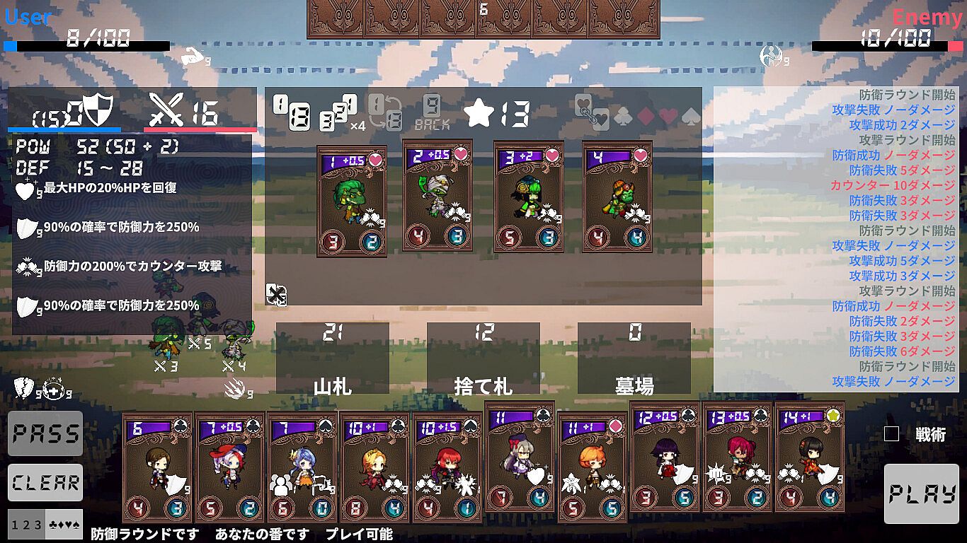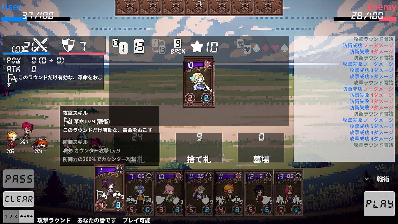 This game incorporates deck-building and roguelike elements into the highly popular Japanese card game "Daifugo." The card-playing rules follow the principles of "Daifugo." In other words, players take turns playing cards that are stronger than the ones currently on the table. If you are on the offensive and successfully play stronger cards than your opponent, you can deal damage to them. Conversely, if your opponent is attacking, you must defend against their attack with stronger cards to avoid taking damage.The basic rules of "Daifugo," such as "Revolution," "Binding," "Eight Cut," and "Shibari," are also included. These can occur through traditional card combinations according to the rules or through the skills that cards possess. Moreover, these effects can also be nullified by specific skills.