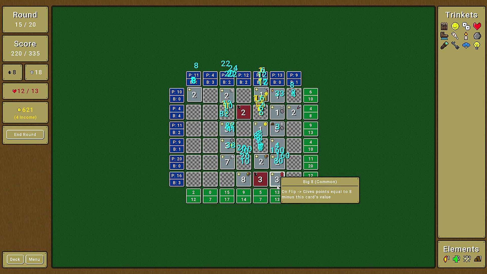 RogueFlip is a roguelike deckbuilder built around a logic puzzle game that is a hybrid of Picross and Minesweeper. Drawing inspiration from genre giants like Balatro and Slay the Spire, the game comes with powerful upgrades and progression over the course of a run like Trinkets (global bonuses), Stickers (bonuses from one card), and Upgrades (modifications to one card) as well as deep synergies between all the interlocking mechanics and a splash of randomness to create an endlessly replayable experience.
