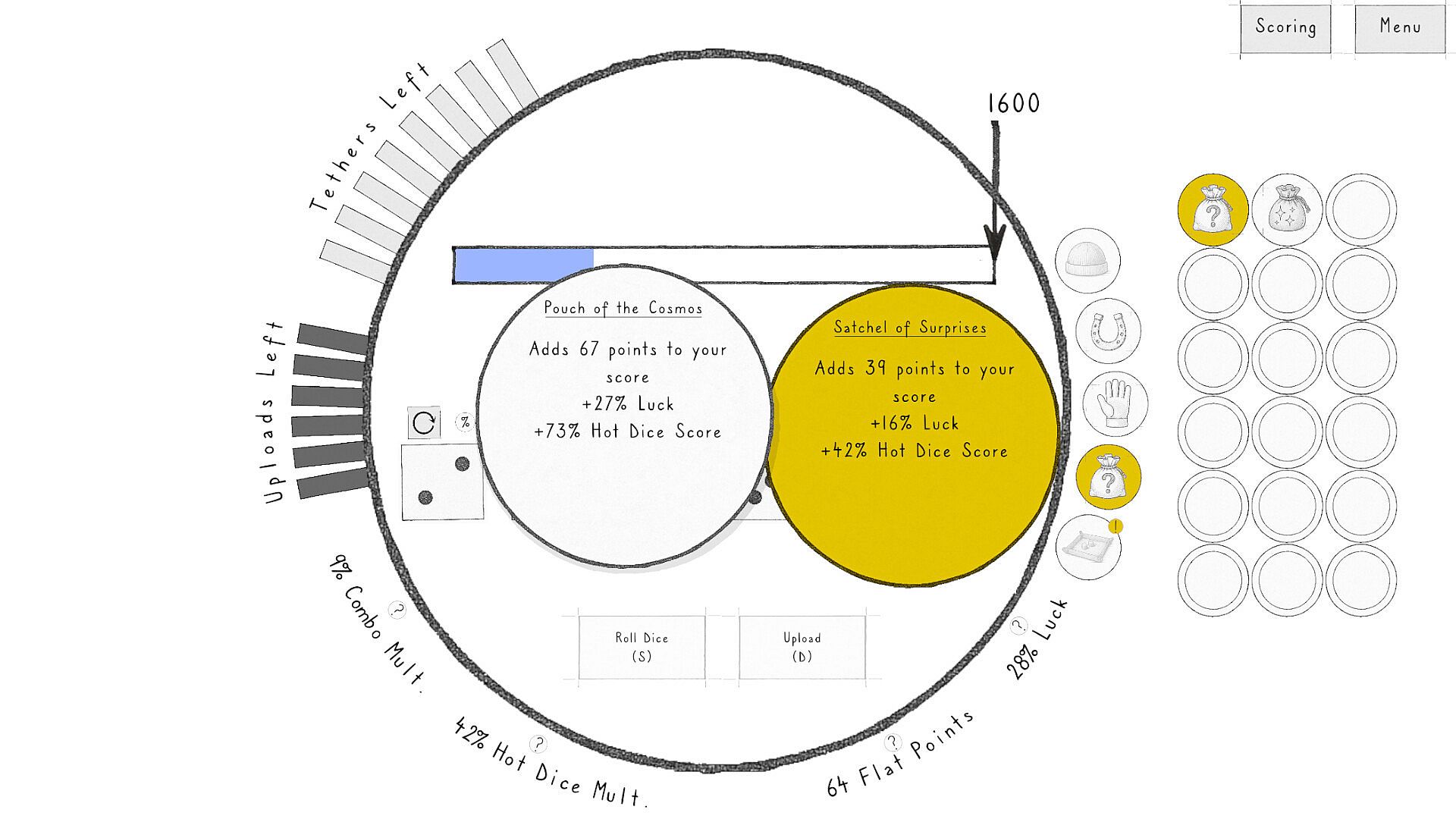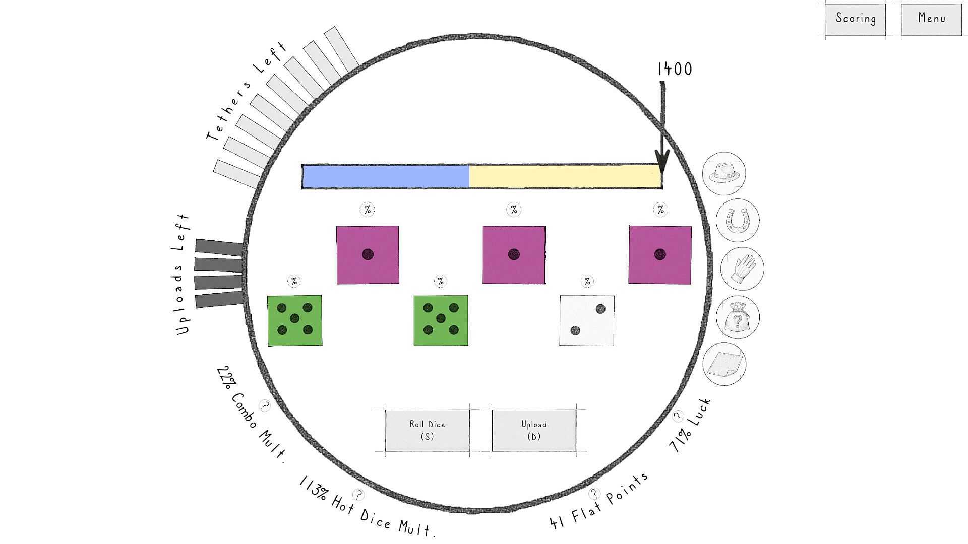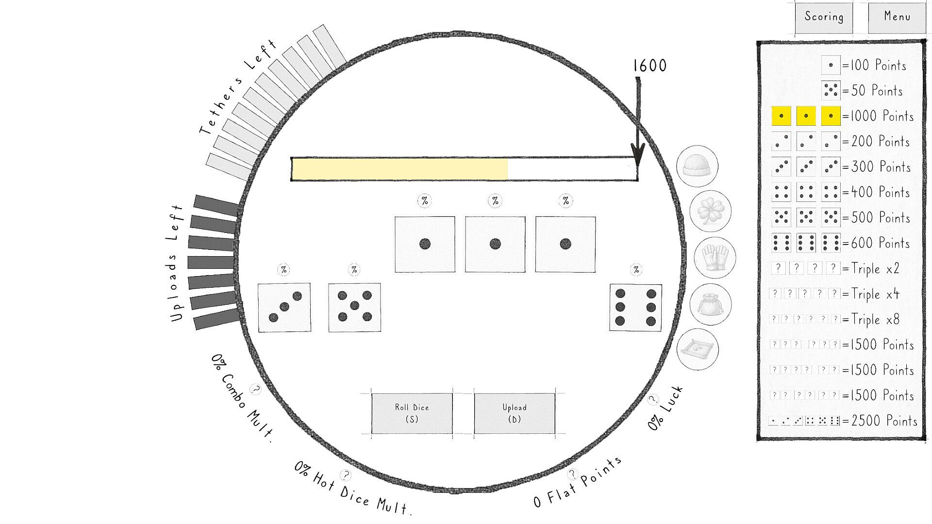 Equip the Jesters Cap to boost your Luck stat, highlight key scoring combos, and ensure your first Farkle doesn't consume a bank charge.