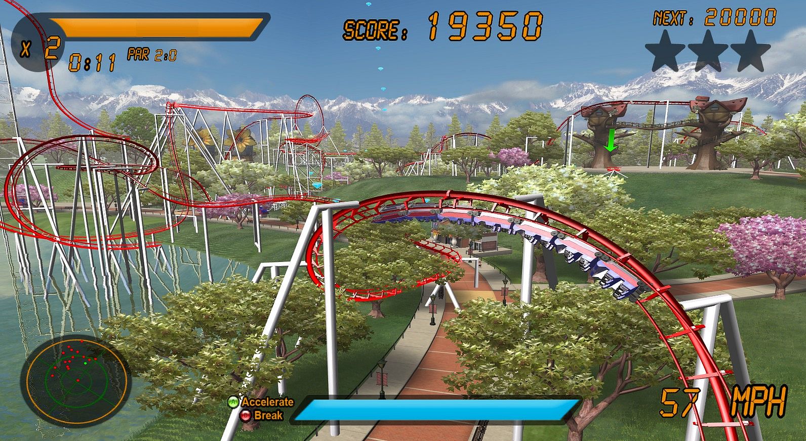 Roller Coaster Rampage revolutionizes the coaster genre by introducing on-the-fly track construction and deformation. In previous games the coaster riding experience was a passive, non-interactive experience. Roller Coaster Rampage introduces an innovative approach, and a specialized procedural coaster engine that allows players to build coasters in real-time as they ride them. Players leave behind a trail of procedurally-generated coaster tracks and supports, which then become obstacles as the player circles back. While riding players can also dynamically connect to isolated track segments like loops, cobra rolls, bat wings, and barrel rolls. With these innovative game features and engine technology players can now build coasters while enjoying a fast paced, arcade style, roller coaster racing simulator.