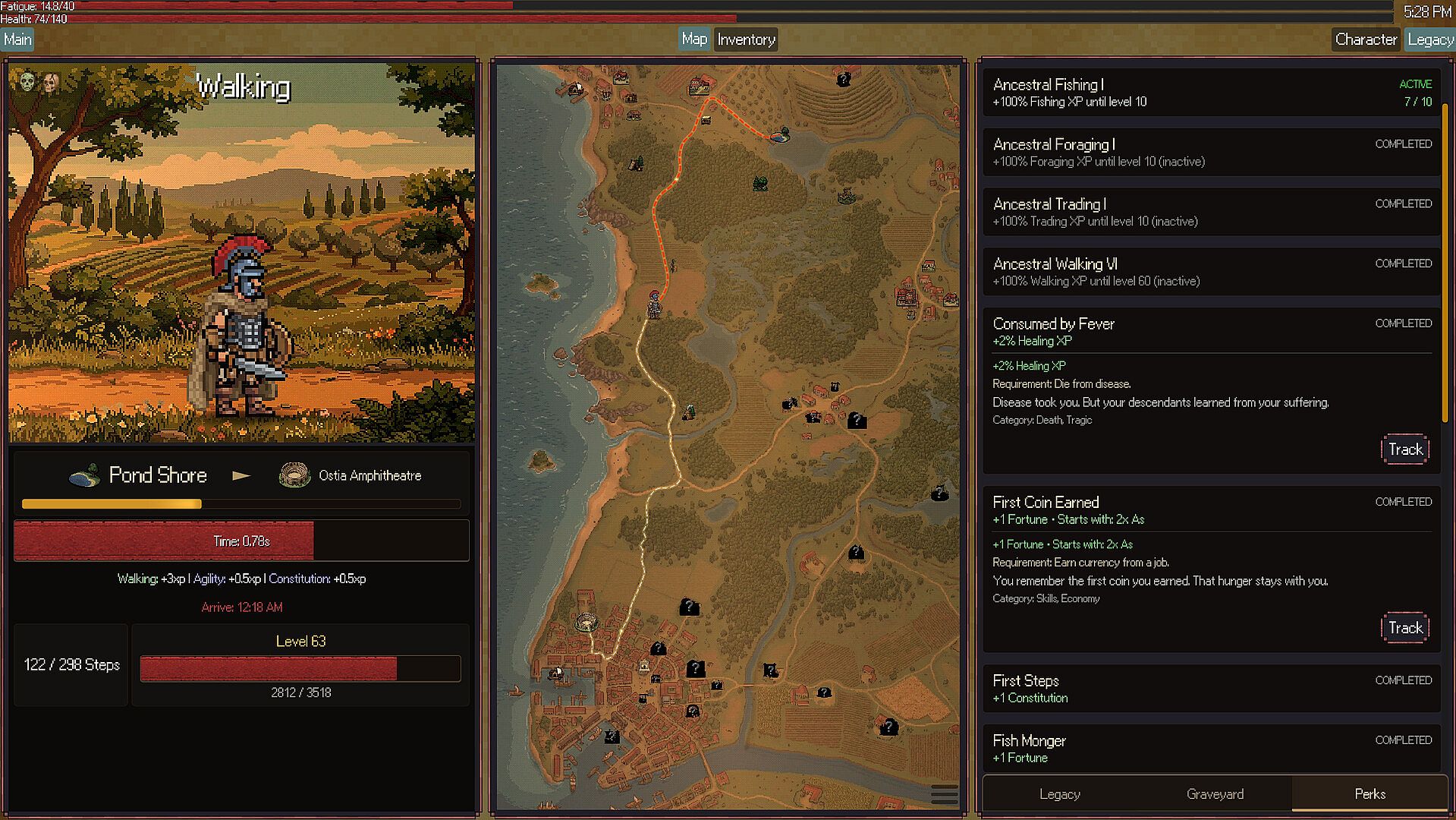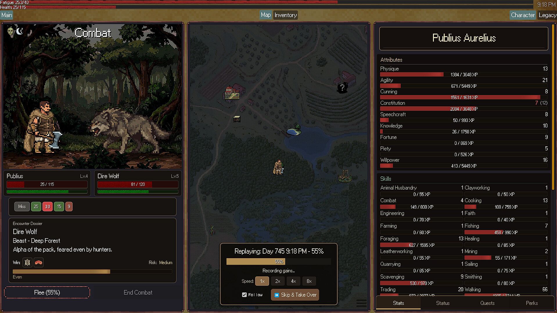 Your character keeps living while you're away. When you return, replay the timeline: the roads they walked, the jobs they worked, the tavern brawl that left them limping home, the merchant who cheated them, the fever that nearly killed them.