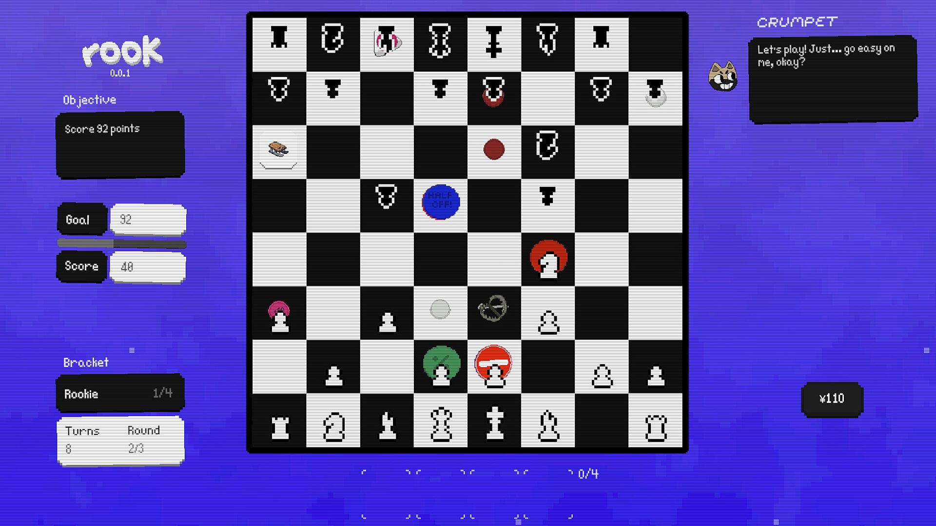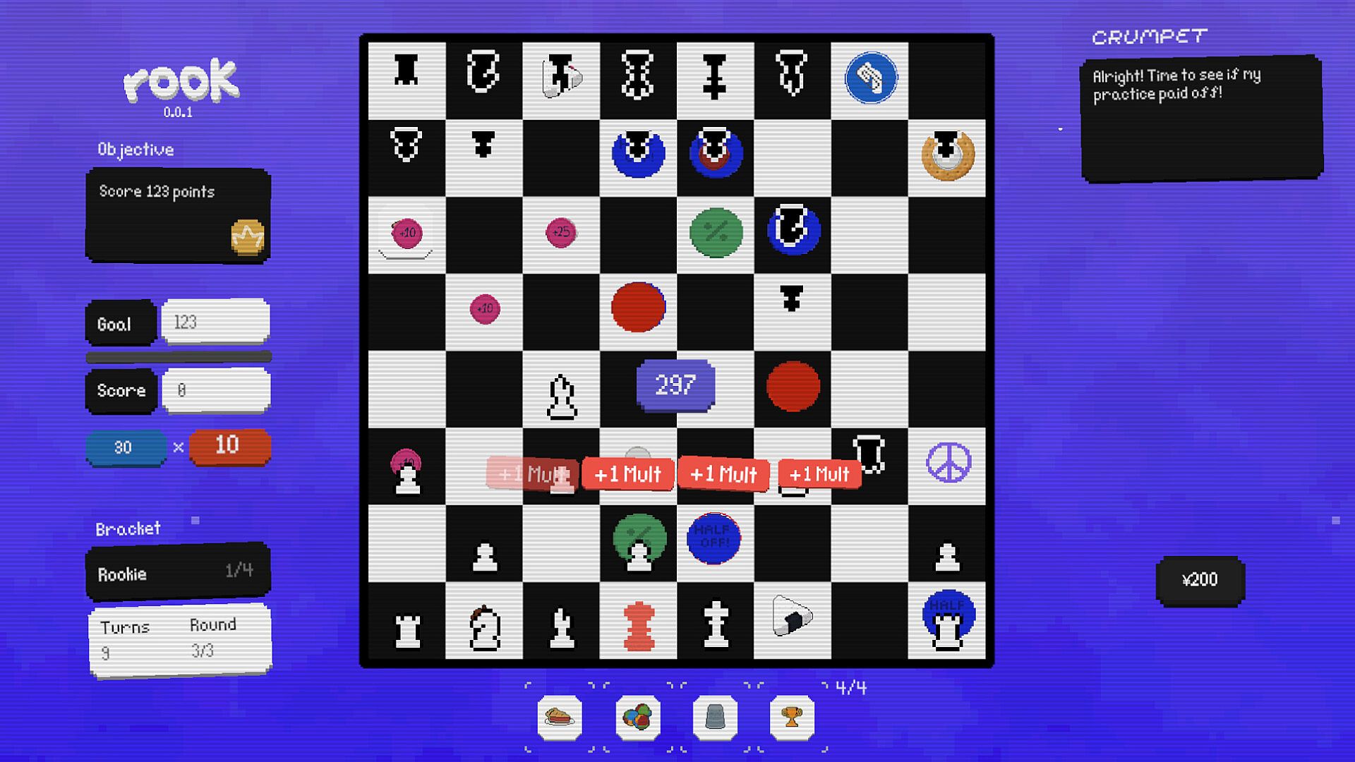 rook is a chess roguelike where captures score points, pieces get permanent upgrades, and sticker and spare tiles combos spiral into the thousands.