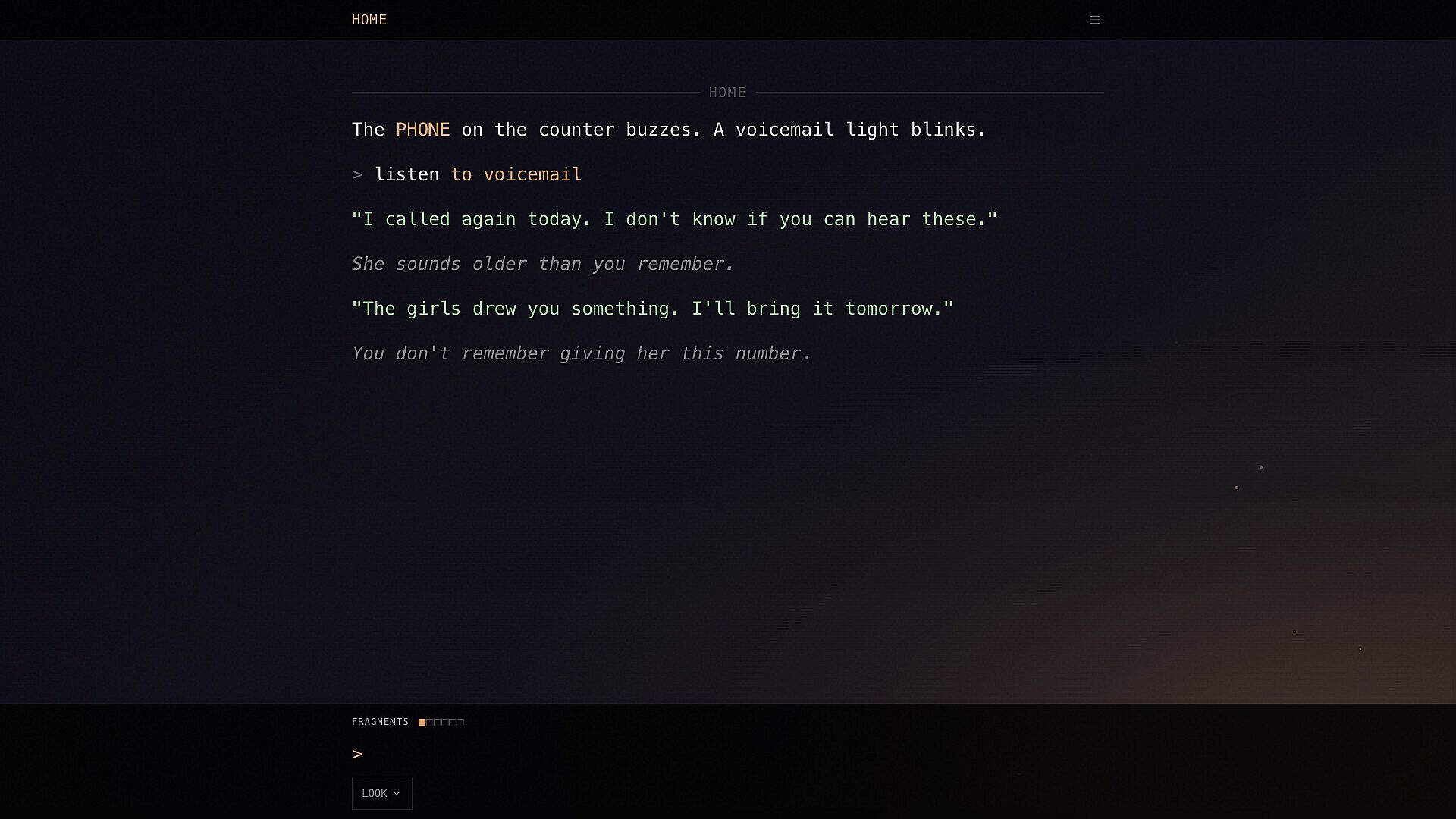 A full sensory experience... voice acting from a real father and his daughters, dynamic visual effects that respond to the story, mini-games woven into the narrative, ambient soundscapes that make rooms feel alive, and a cinematic original score. Every moment is designed to pull you deeper.