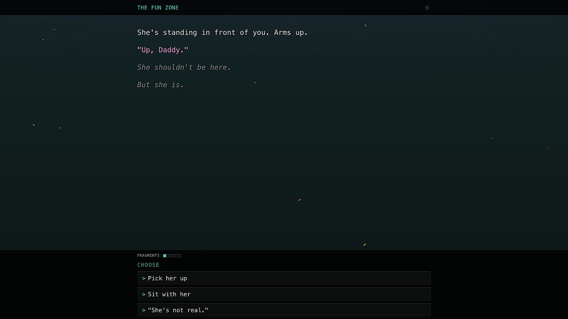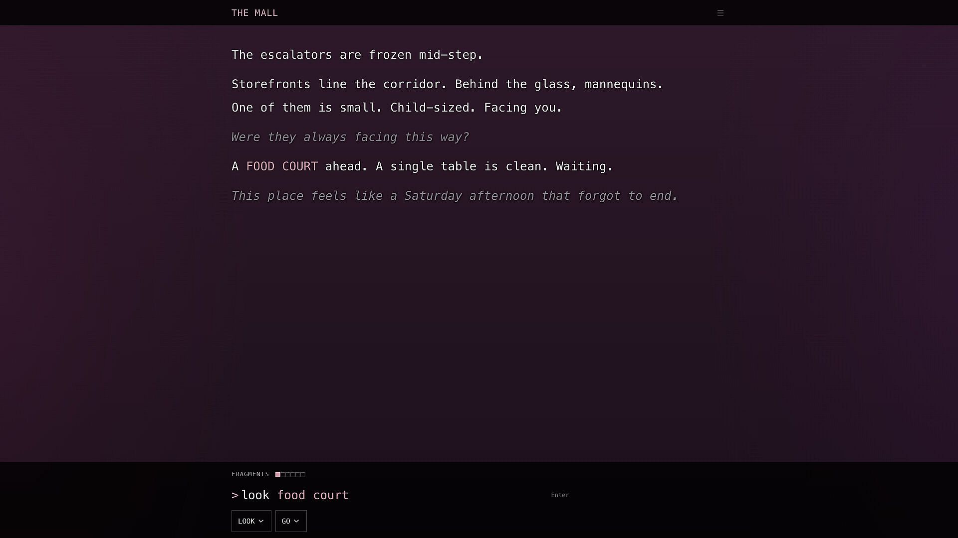 Fluorescent lights flicker overhead. Somewhere ahead... voices you recognize. Small, bright, reaching for you. The deeper you go, the harder it becomes to tell what's real.