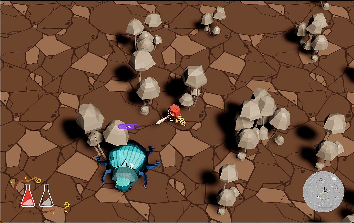 Ants are the characters companions. They have their own action set and are not controlled by the character. They can attack enemies or help the character carry things back to the Hive.