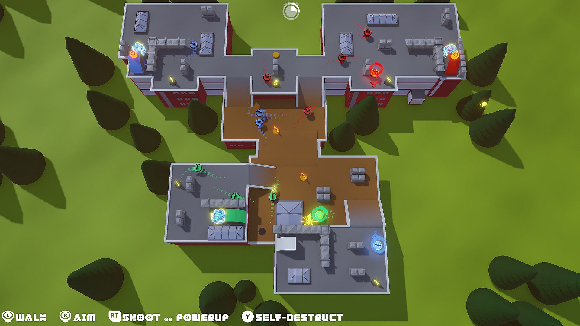 Gain the upper hand by using rockets and shields to improve your map control. Your followers do the same - unless someone steals the powerup first and alters the past.