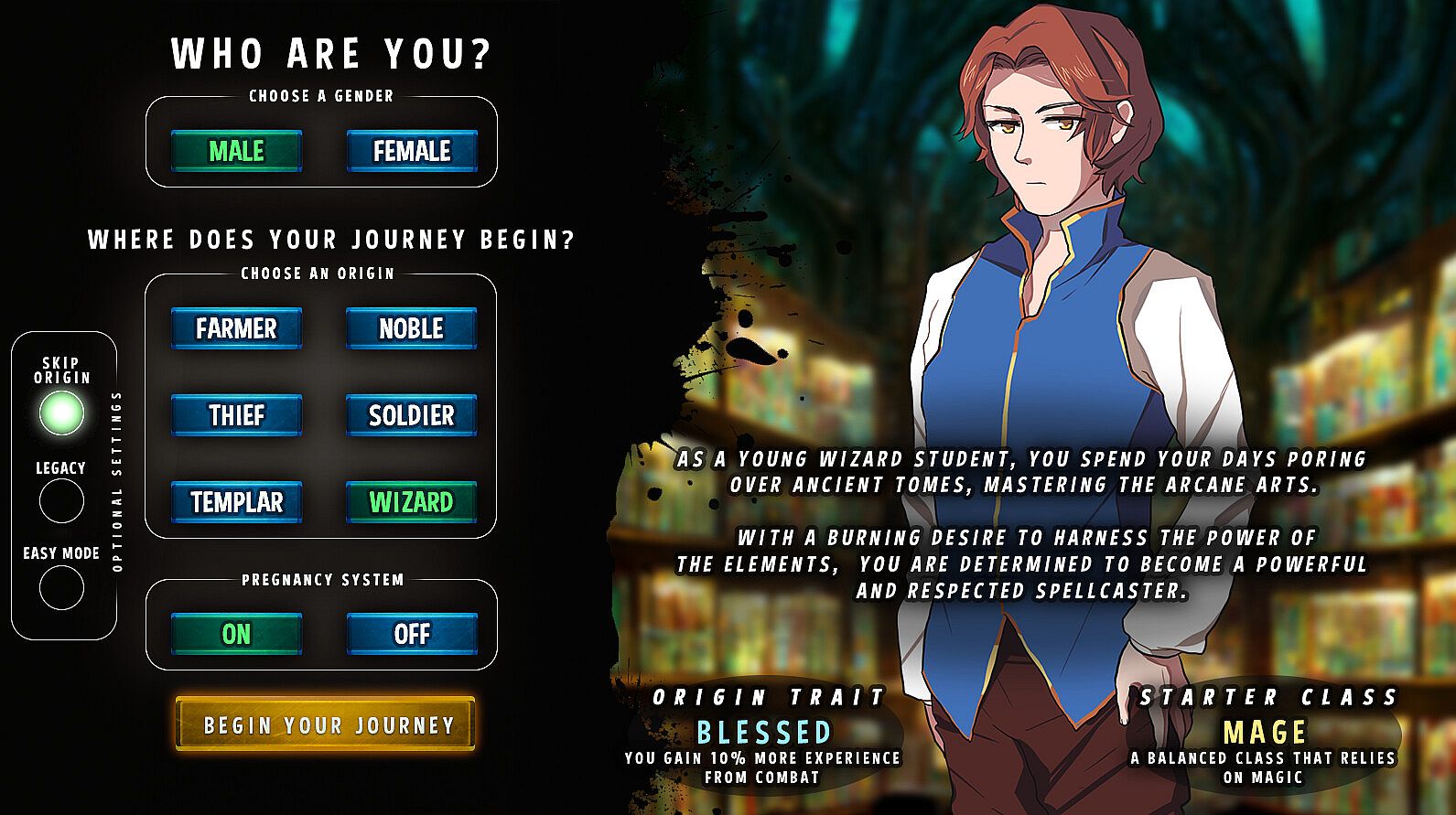 Choose your gender and origin from six distinct options: Farmer, Noble, Thief, Soldier, Templar, or Mage. Each origin provides unique content and characters. Recruit 12 unique companions, each with their own personality, companion quests, and lewd scenes. Your choices may even influence the personalities of some companions.