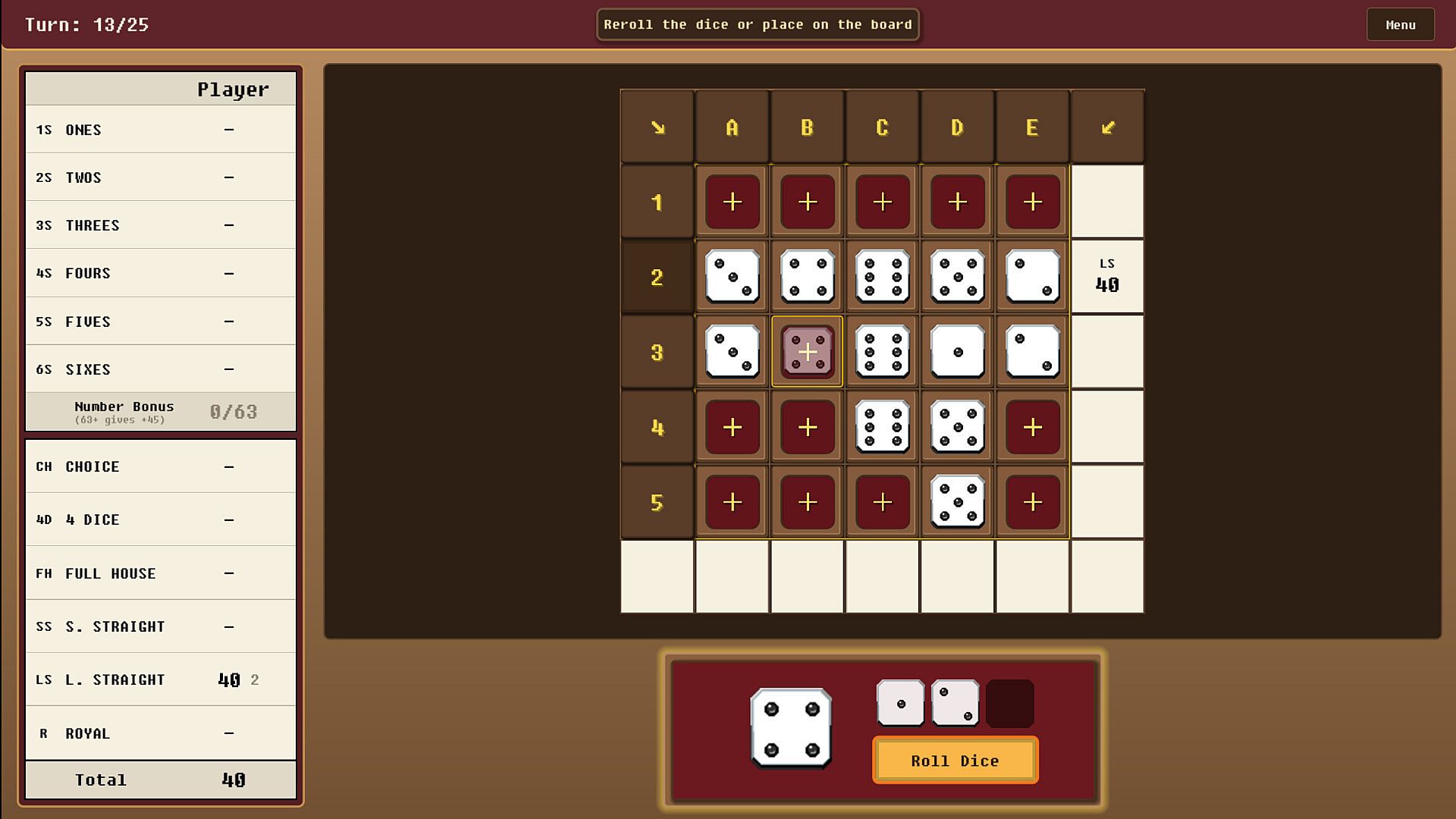 • Decide where to use high-scoring categories (Royal 50pts, L.Straight 40pts)
