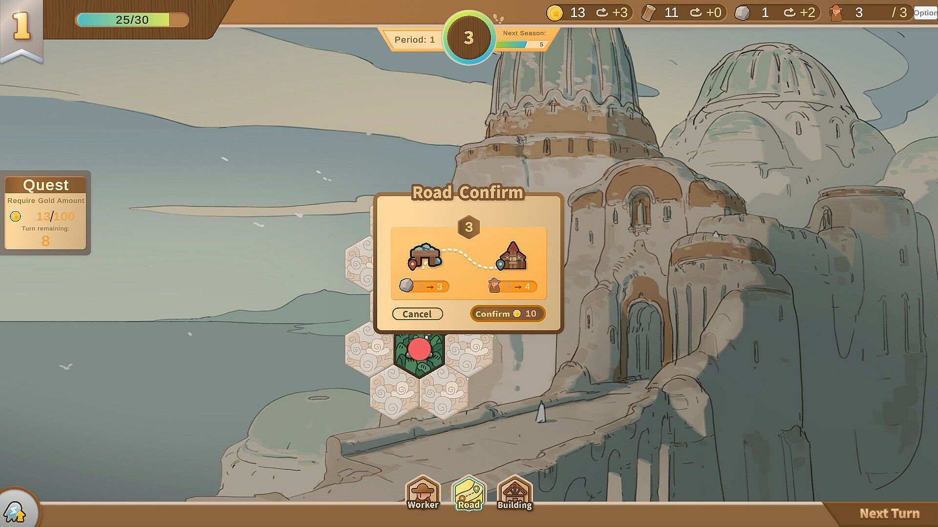 To prosper, one must first build roads. Buildings linked by roads will see a significant increase in production efficiency. Planning the roads within your kingdom wisely is the key to prosperity.