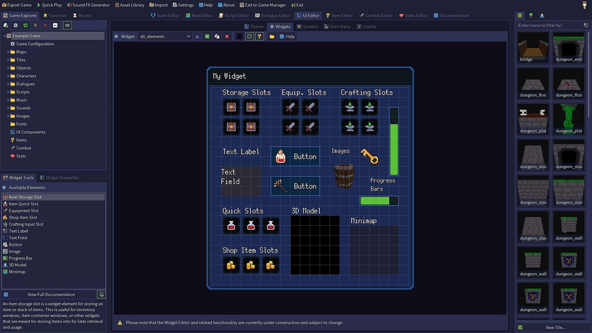 Design themes and customize the appearance of many other interface elements such as the inventory, main menu, and credits roll. The powerful widget system allows you to easily create unique mechanics for your game.