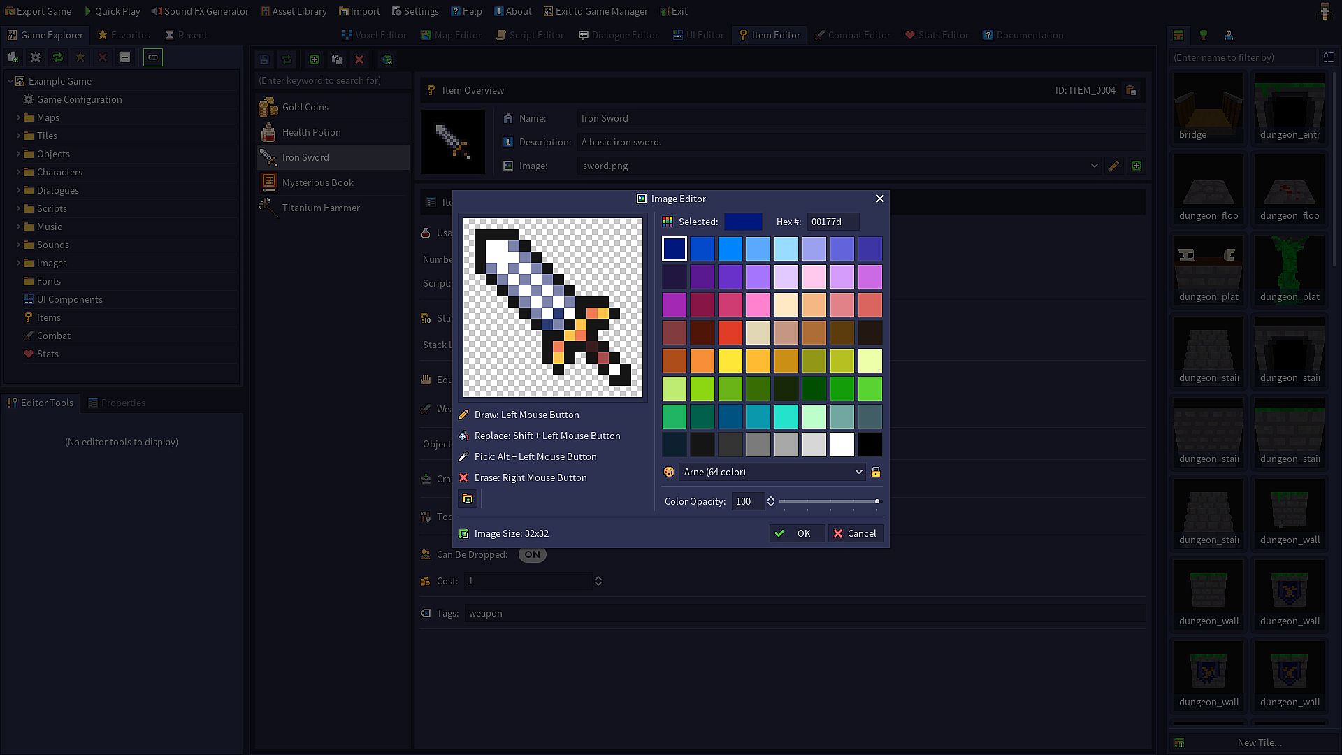 Define items for the player to find in containers or earn through the completion of tasks. Attach scripts to trigger effects for potions and other consumable items.
