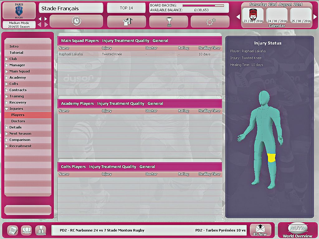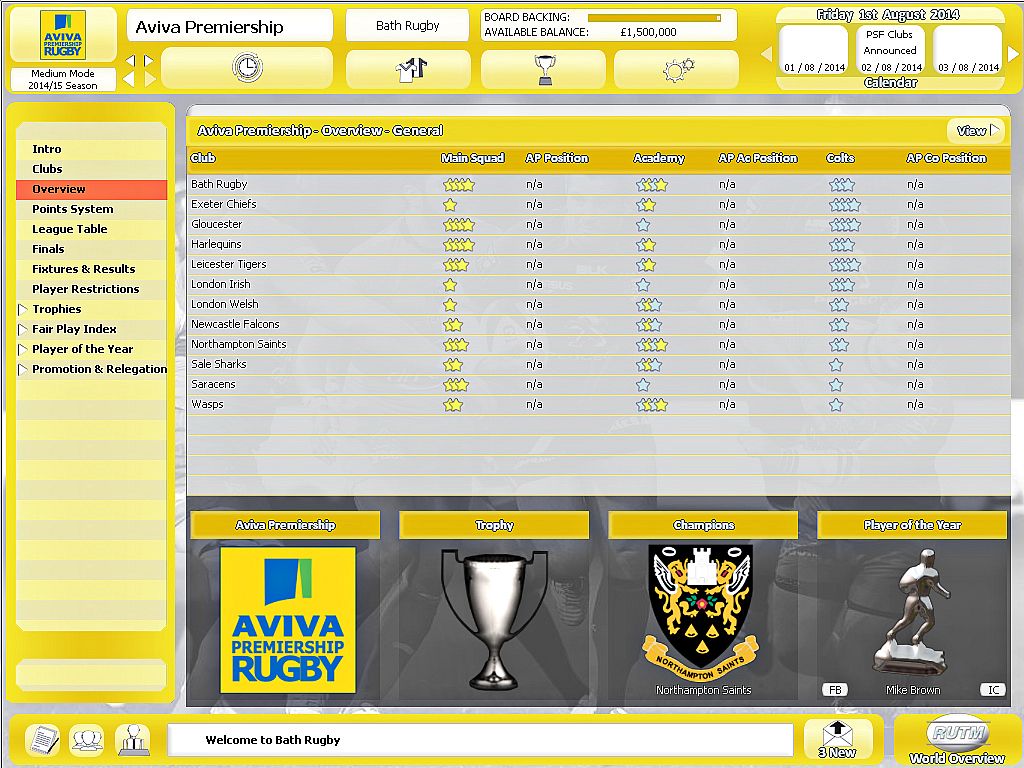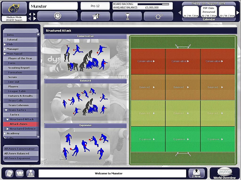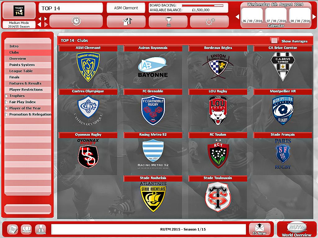 Rugby Union Team Manager 2015 immerses the player in the dynamic world of Rugby management. Allowing the player to battle their way through season after season; securing success both on and off the field. Pleasing the fans, and the star players whilst maintaining the backing of the boardroom. You are in complete control!