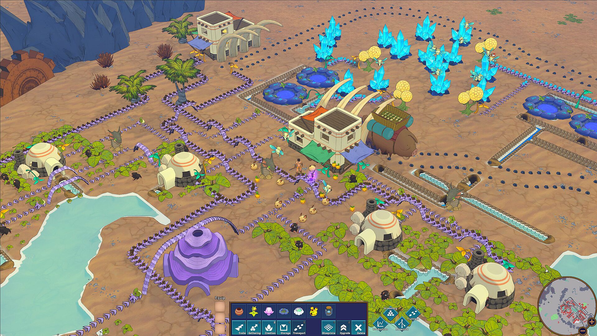 You progress from simple creatures, to developing farming, mining and beast/dragon timing, and eventually work your way up to constructing high-magic artifacts. The way you attain research and upgrades in the game is by searching for the corpses of dead gods; When creatures as vast and powerful as gods die, their powers do not dissipate all at once. Fragments of their soul still linger. These divine remnants can be harvested, used, and converted into something else. To help navigate and explore this broken land in search of dead gods, there will be creatures that you can mount and ride, such as Sabercats and Wyverns.