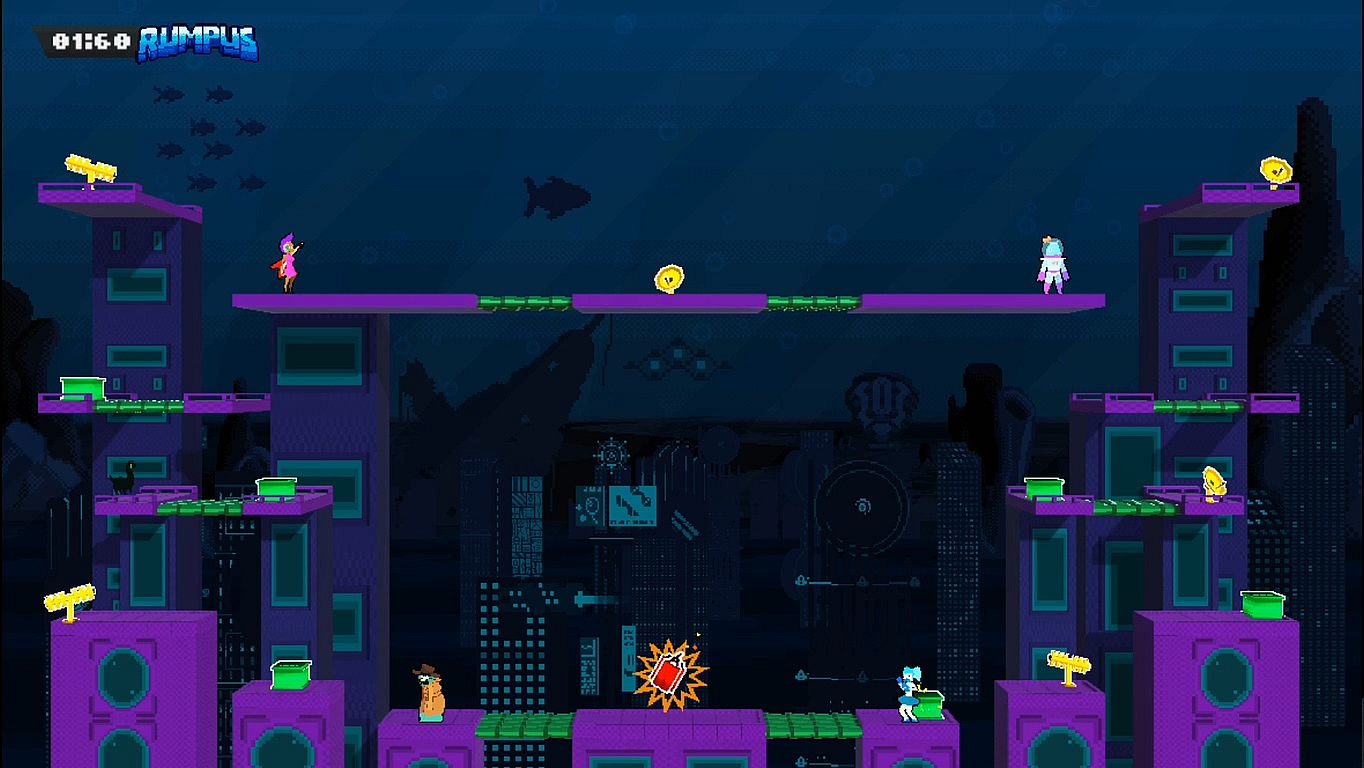 Hosted by the ever-charismatic Mr. Rumpus and inspired by the golden age of couch multiplayer, Rumpus is a fast-paced multiplayer action game, chaotic and intense. Players have to pickup and throw items at each other to throw them off the screen. Items can be charged for extra shot speed. Players can also create a shockwave to reflect shots and fight in melee combat, for some added strategy.