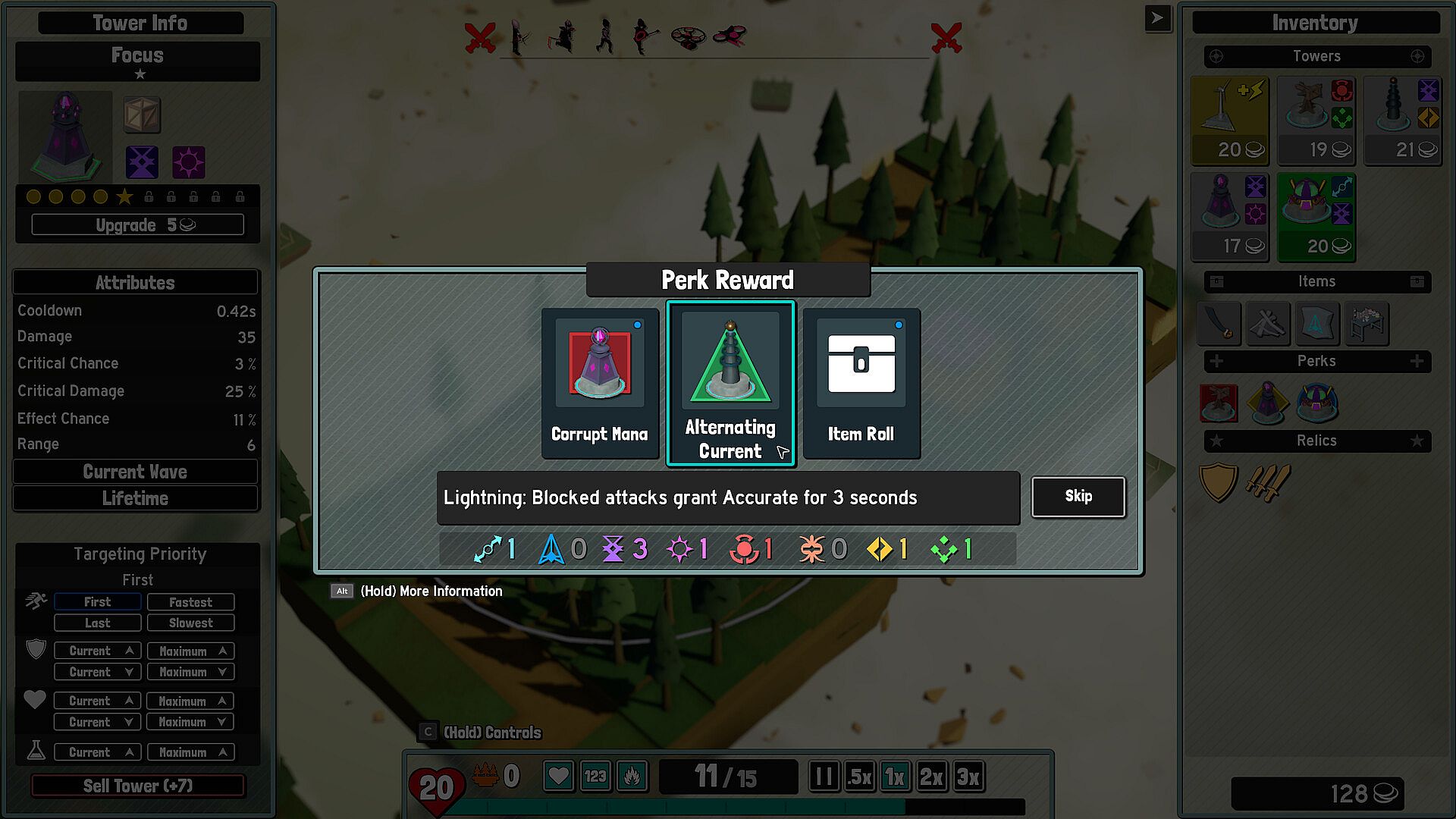 There are a variety of upgrades you can pick throughout each run. Perks modify a specific tower type, items enhance a single tower, and Relics which are global modifiers drastically changing the way each run is played. Do you make one super tower? Or spread the perks across many different towers?