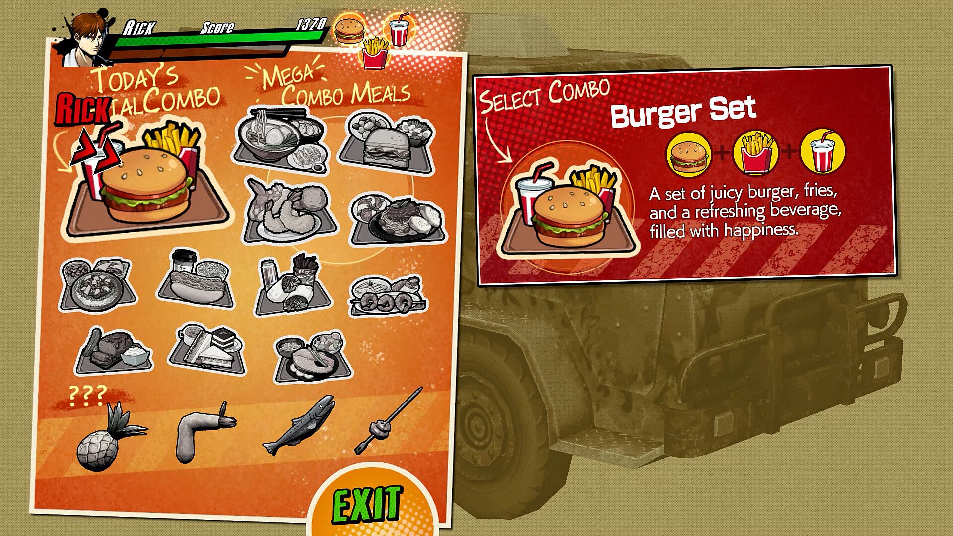 At the Tuff E Nuff, kitchen car, which also serves as a checkpoint in stages, you can combine the various food items you have. Creating combo meals with three types of food increases healing potential and may also grant special effects! Whether attacking or eating, combos are the way to go!