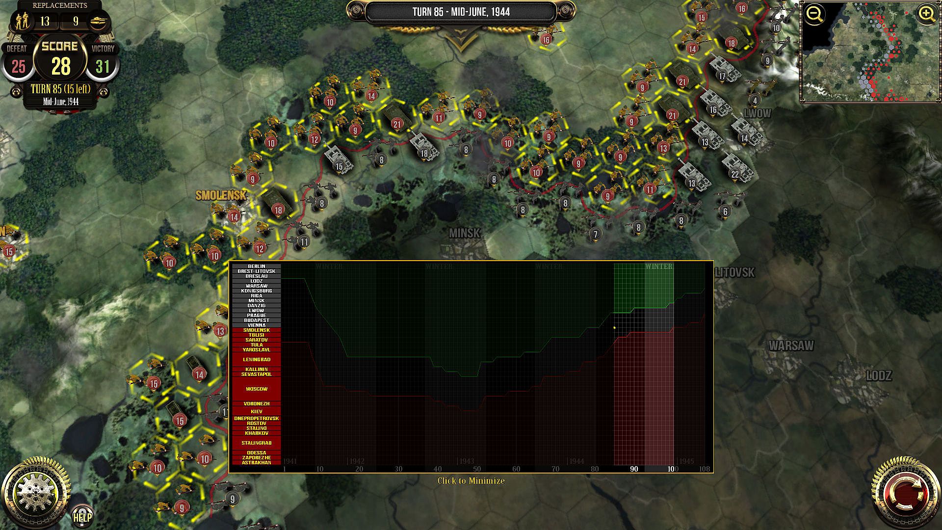 Start in the early days of Operation Barbarossa and follow the German invasion of Russia through to its ultimate failure. Or start later in the war and jump straight into the Russian counter push to Berlin. A massive 108 turn campaign will take you from the opening stages to a final, overwhelming Russian offensive. Four shorter Operations, spanning 16 turns each, take place from June to December of each year and offer a more condensed experience.