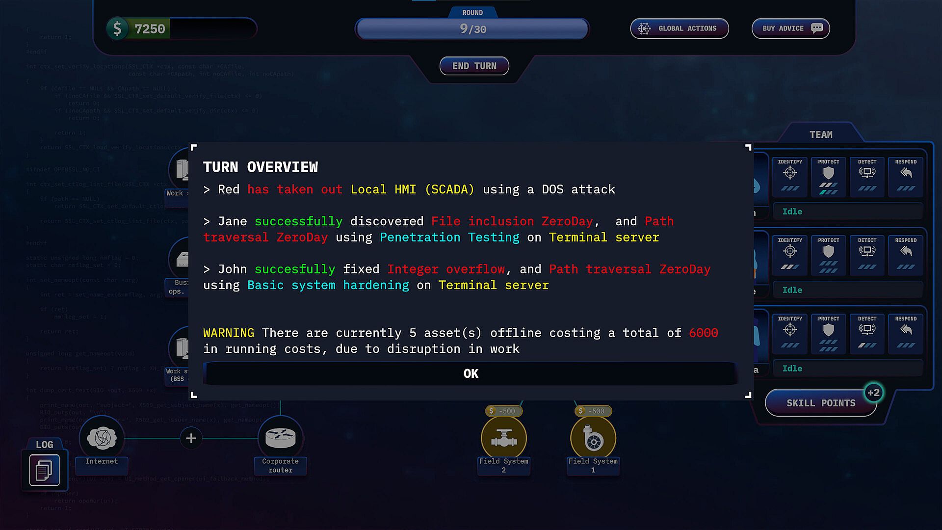 The game excels at visualizing cyber security concepts, such as asset maps, vulnerabilities, and the impact of different cyber attacks. By visualizing these concepts players can gain a better overview of the various components that play a vital role in cyber security management. By further implementing these concepts in a game scenario, players can explore different relations between these components, and how they interact with one another.