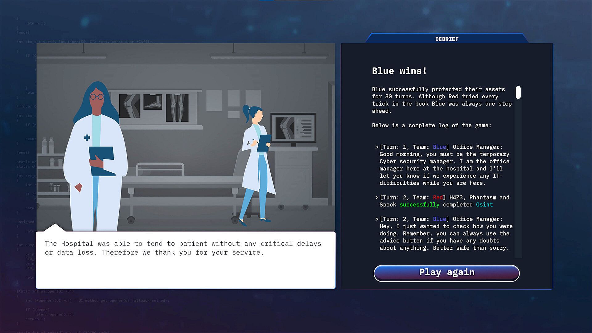 The two sides have different abilities and conditions. Red are hackers and use an arsenal of offensive actions to complete objectives, while Blue must balance resources, employee training, and close vulnerability gaps before Red discovers them.
