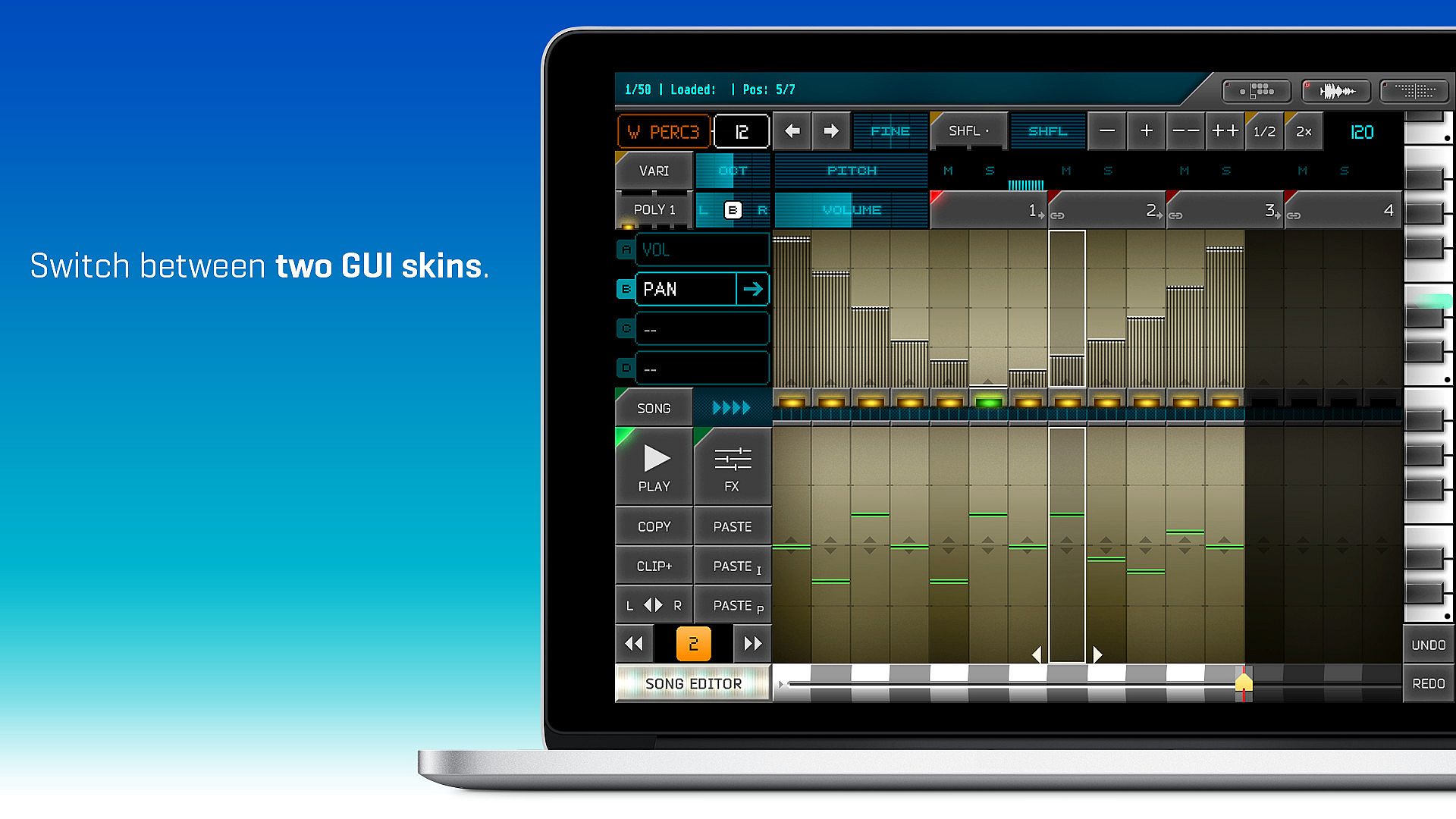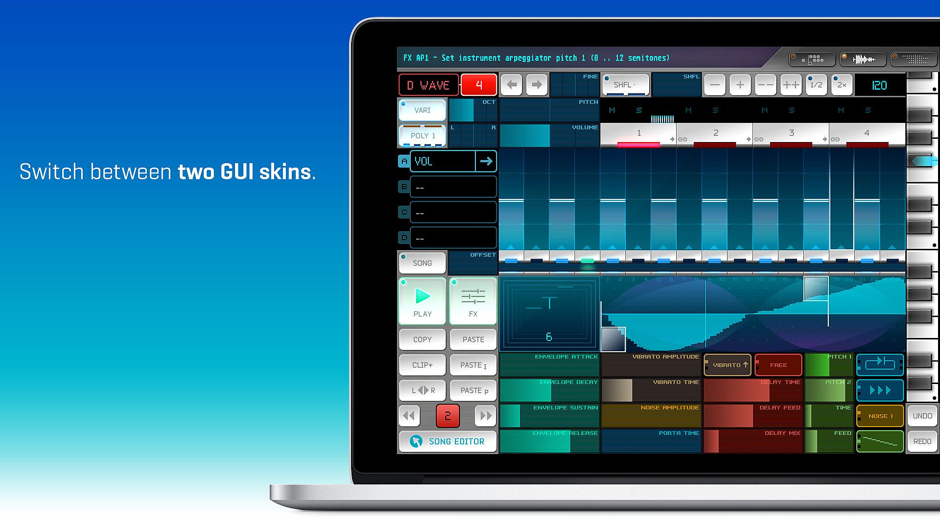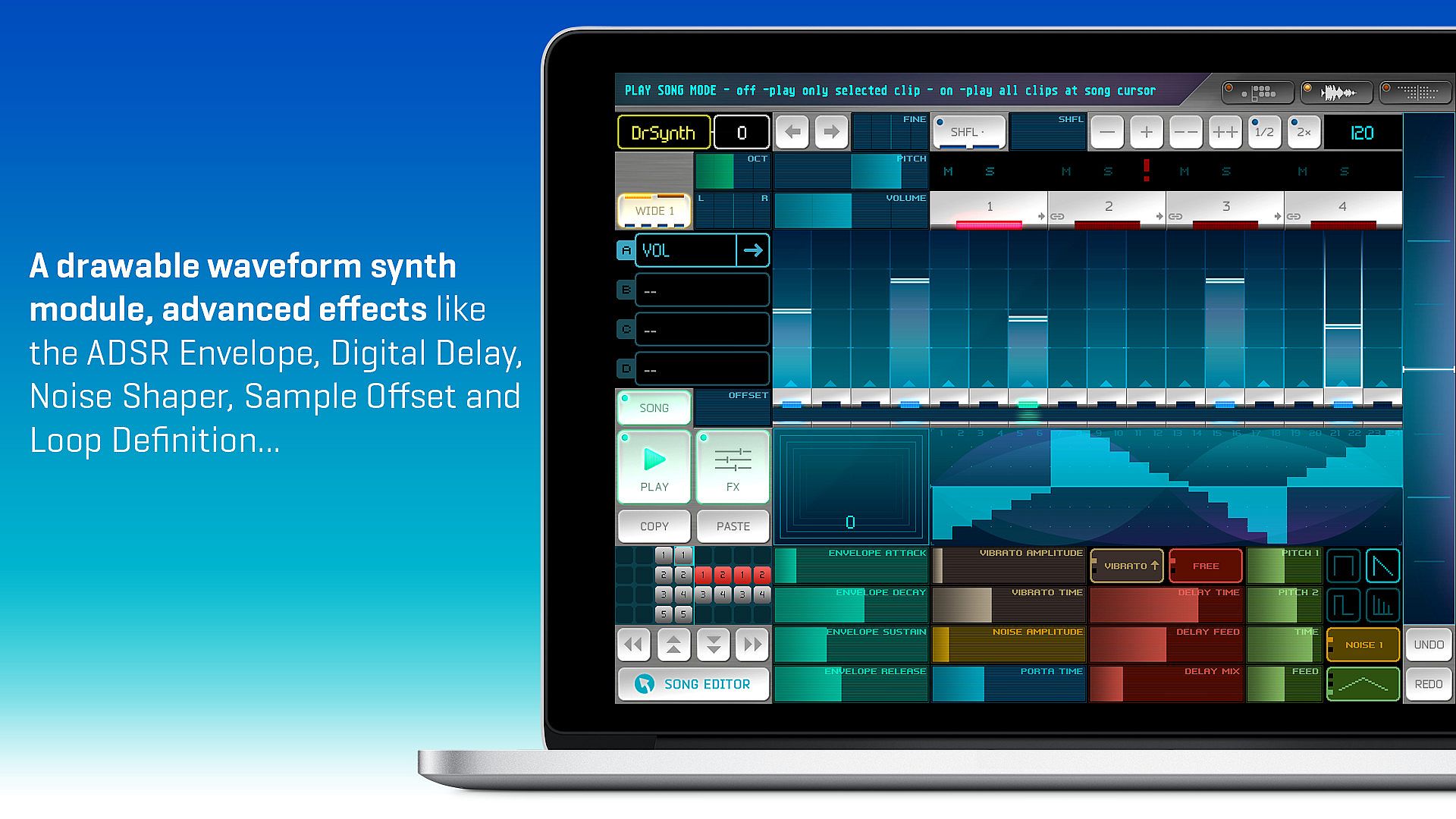 Every instrument is now a wavetable synthesizer. With the advanced effect module, you have more power to shape sounds with the ADSR envelope, vibrato, portamento, noise shaper, or digital delay. In addition to that, the drawable waveform synth module allows users to draw and modify their own wave and use it as a sample oscillator – with that you can use Rytmik Ultimate as a sonically unique chiptune synthesizer.