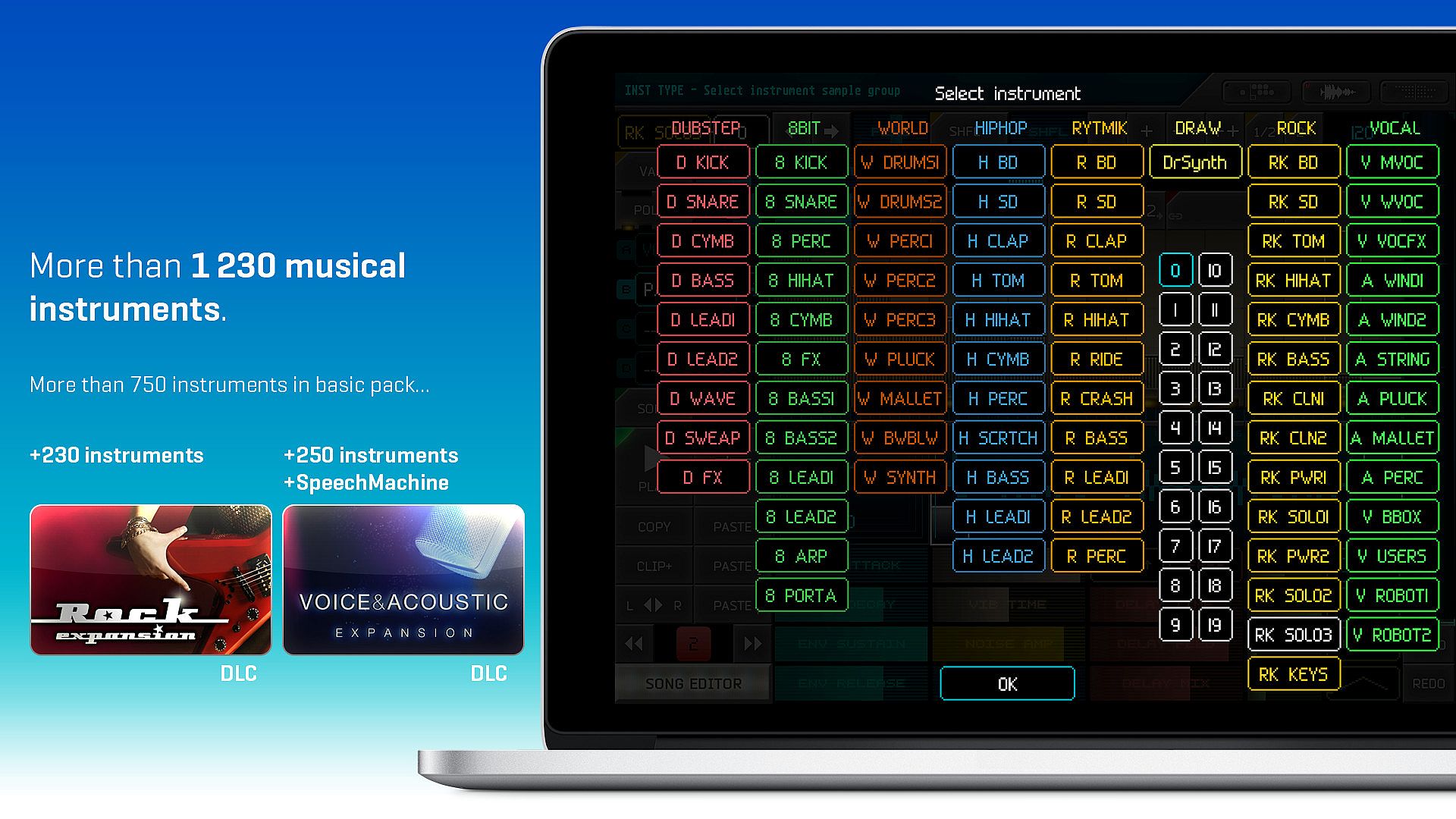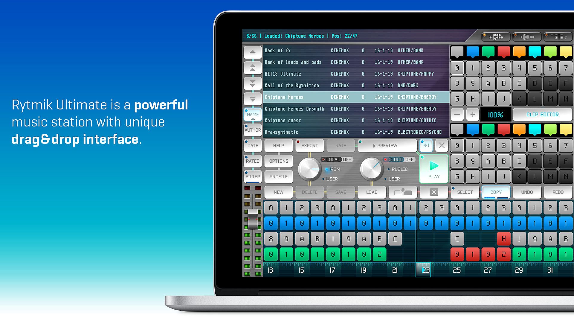 Rytmik Ultimate comes with a sound library of more than 750 instruments containing the libraries of the previous Rytmik series (Rytmik, Retrobits, Hiphop King and World Music) and adding a brand new set of samples ranging from deep dubstep kicks and basses to cutting synth leads and special effects.