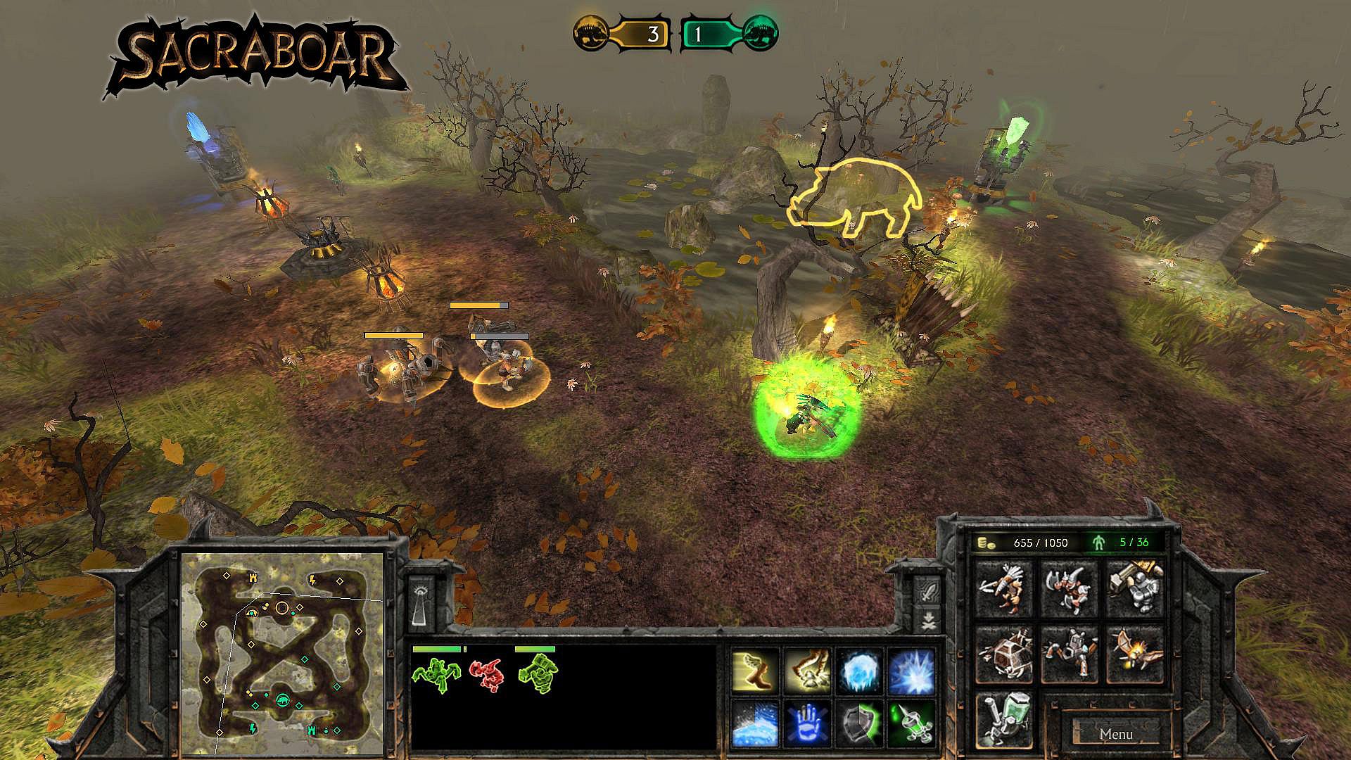 Sacraboar is an RTS game in which players have to capture their opponent's boar trophy. Featuring an intuitive and easy to use resource management system, the game offers fast-paced game play without lengthy and tedious construction phases.