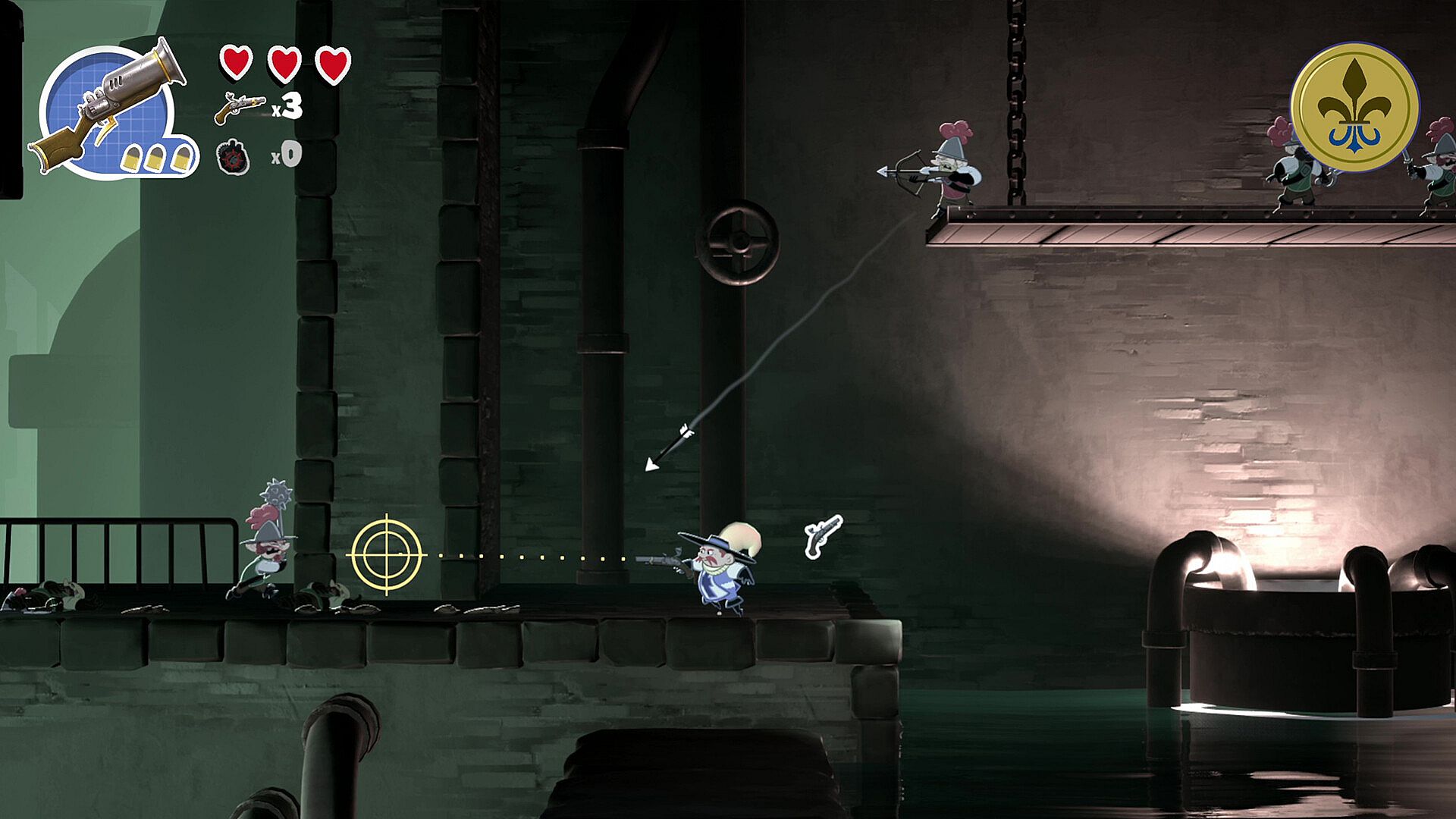 Mon dieu! Some rascal has thrown you, the captain of the Musketeers, into prison – on false charges, no less! Time to grab your blunderbuss and blast your way to freedom!