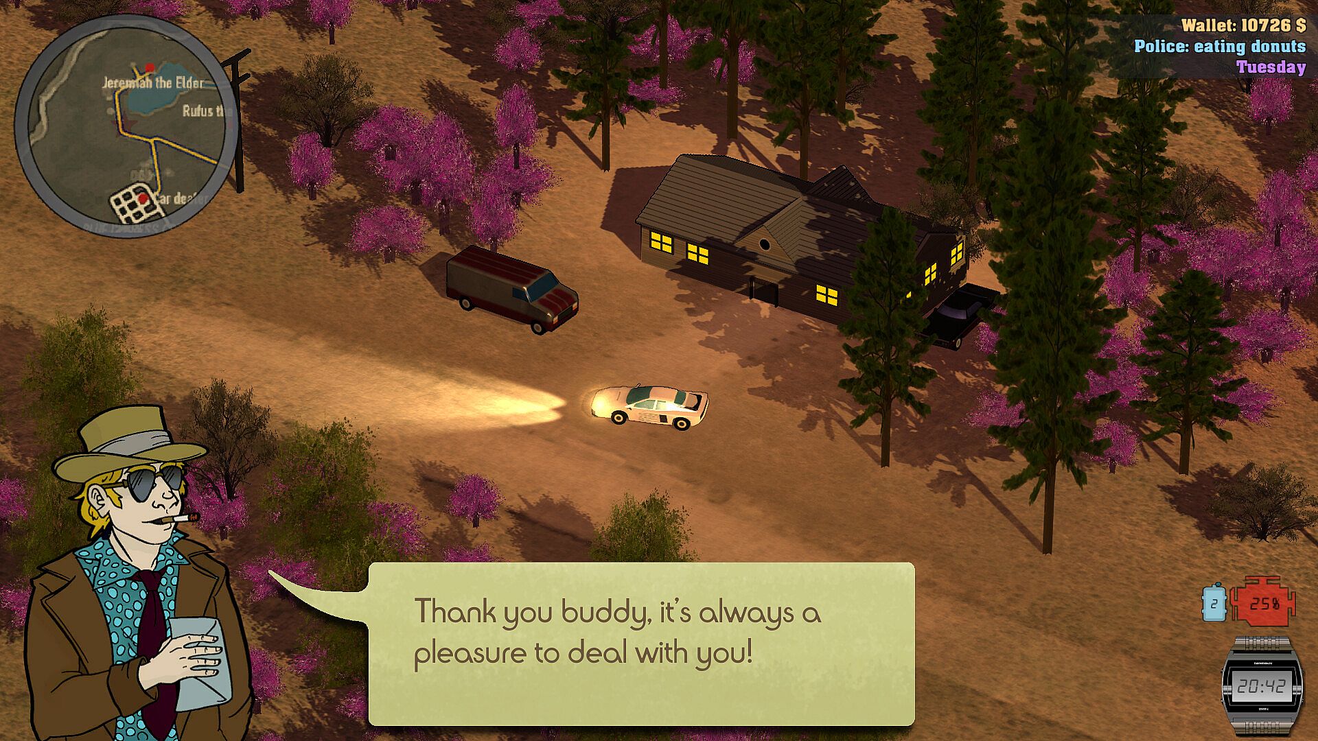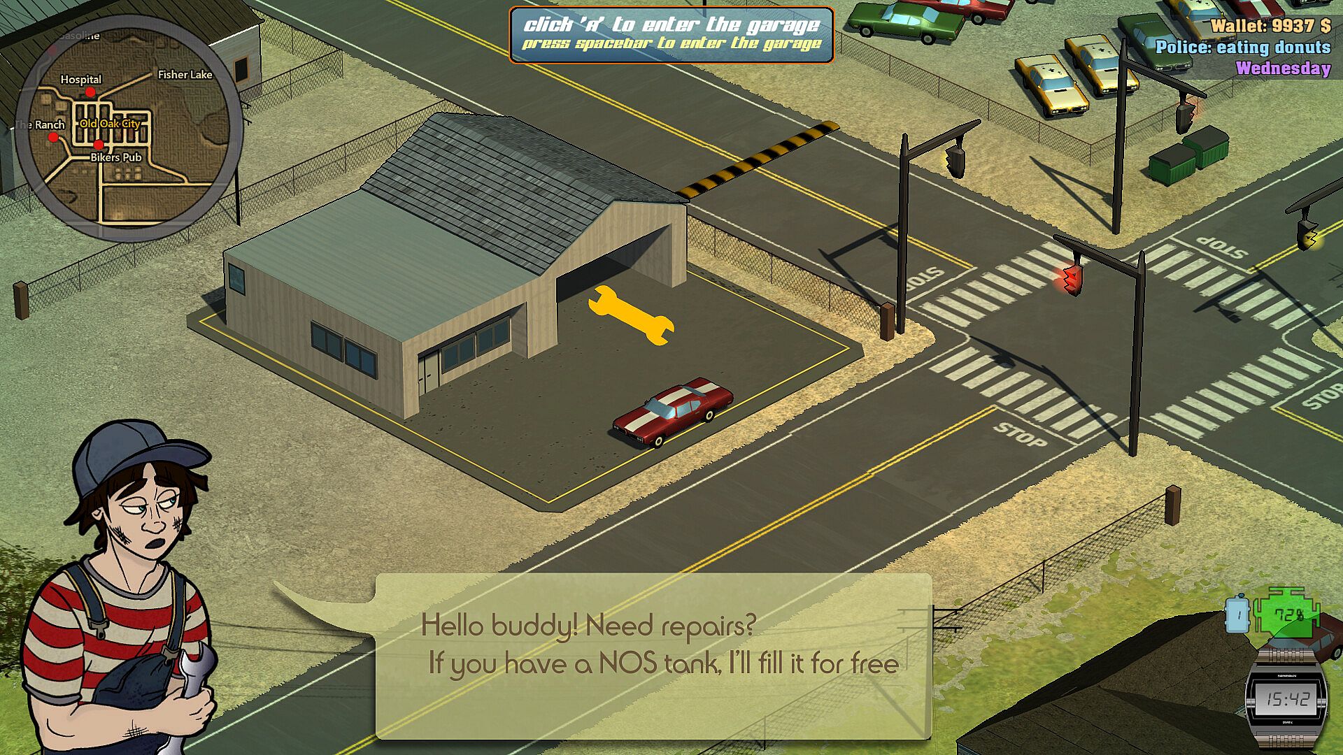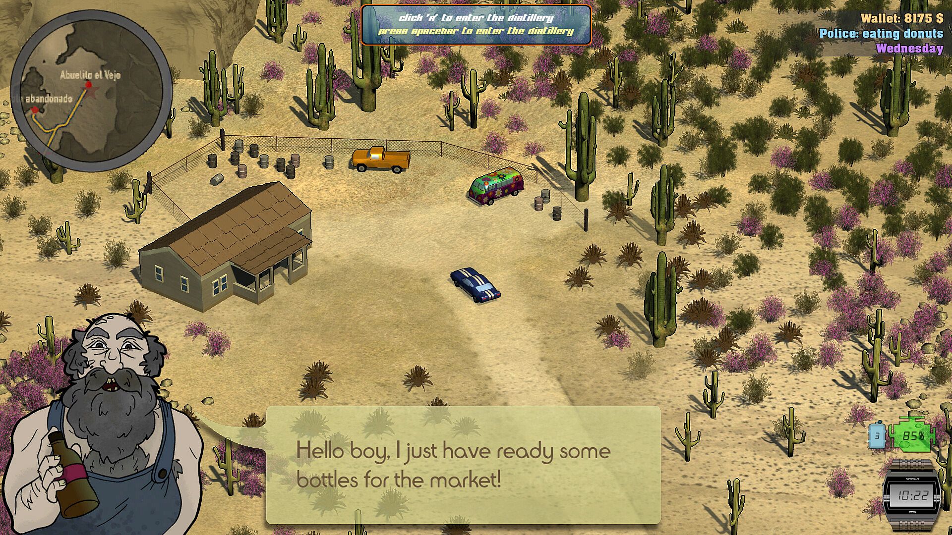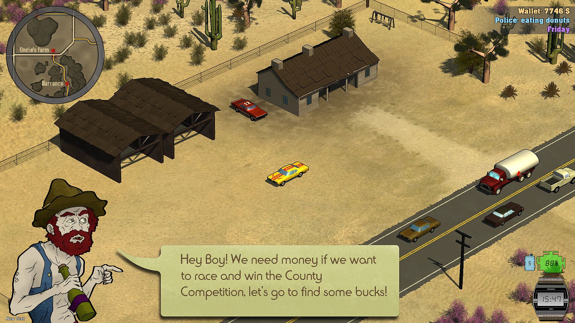 "Saddle Up and Drive" is a game set in the 1970s, where you play as the reckless nephew of an old car driver, now an alcoholic deeply in debt.
