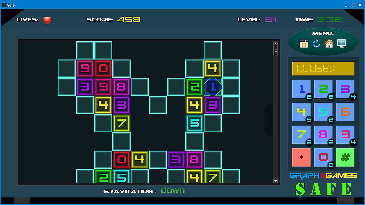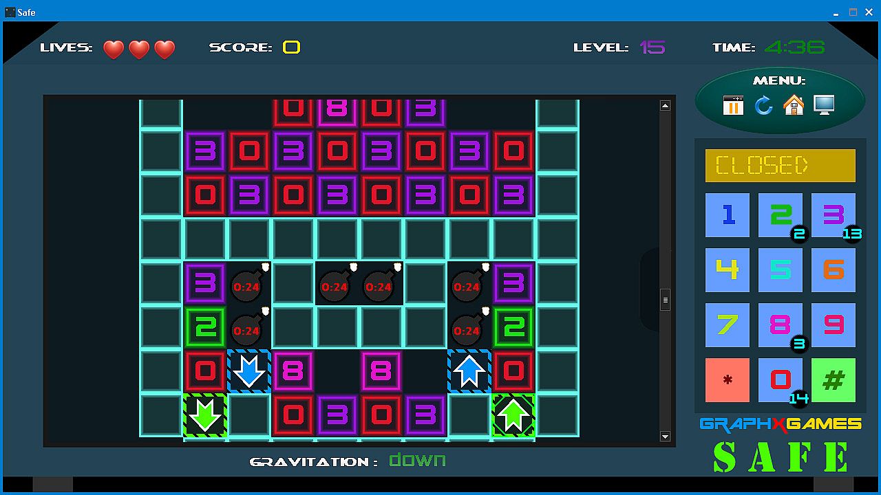 By default, the safe is locked with a digital code. Your task is to collect all digital codes to solve the puzzle and when all the codes are collected then the safe will be opened to get its contents. To pick up a digital code for the safe, you need to move, teleport and combinatory the digital blocks together, at the same time take into account gravity and time bombs that can destroy walls. If you make a mistake when solving a puzzle, you can try again. Remember that the number of attempts to collect a digital code and time is limited.