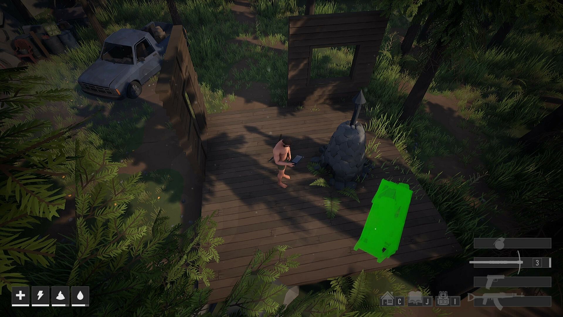 Maintain vital survival stats (health, hunger, thirst, energy) in a harsh world that never stops testing you.