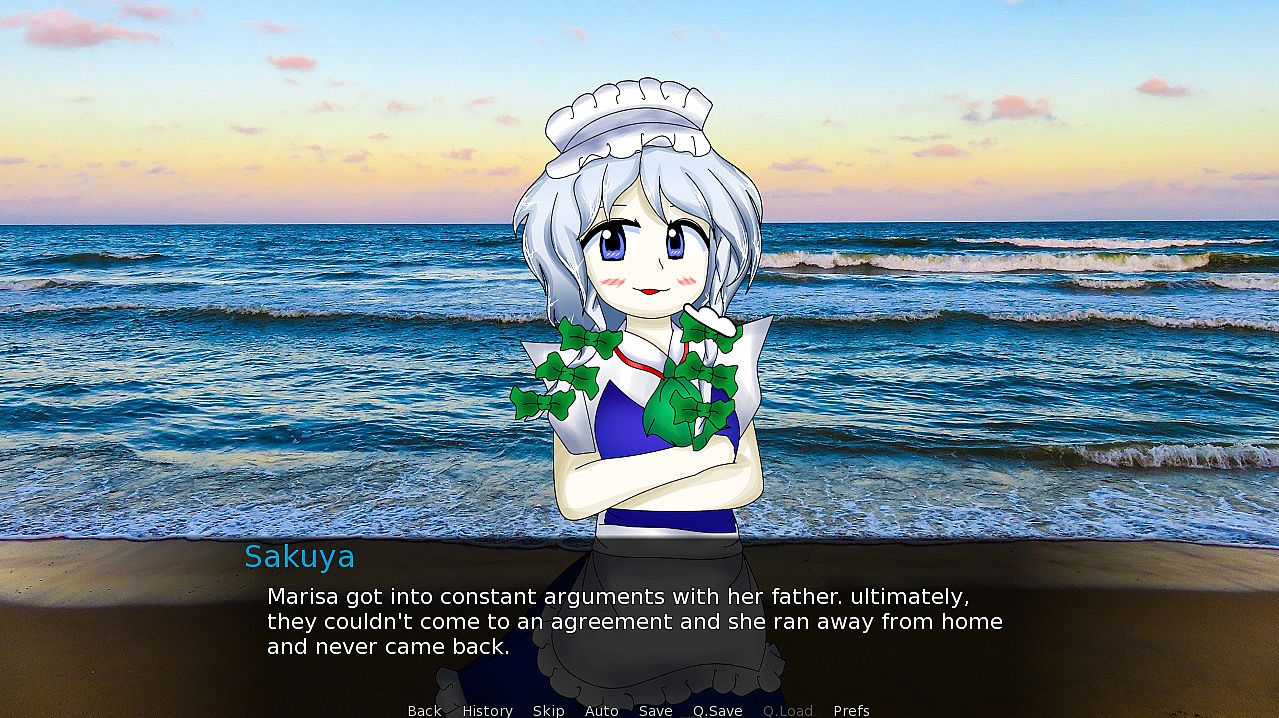 Enjoy an atmospheric scene with Sakuya as she gives you insight and advice into your troubles, whether you're feeling sad, depressed or anxious, Sakuya has some advice and strategies for you to try out. If nothing else, she's got a surprise move for you that's sure to cheer you up! Features very cute ZUN-styled art, an ambient beach scene and practical advice and strategies to help you overcome your troubles.