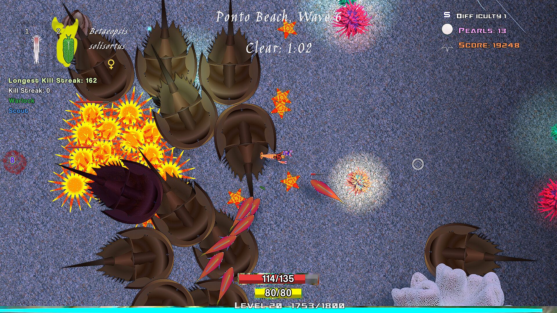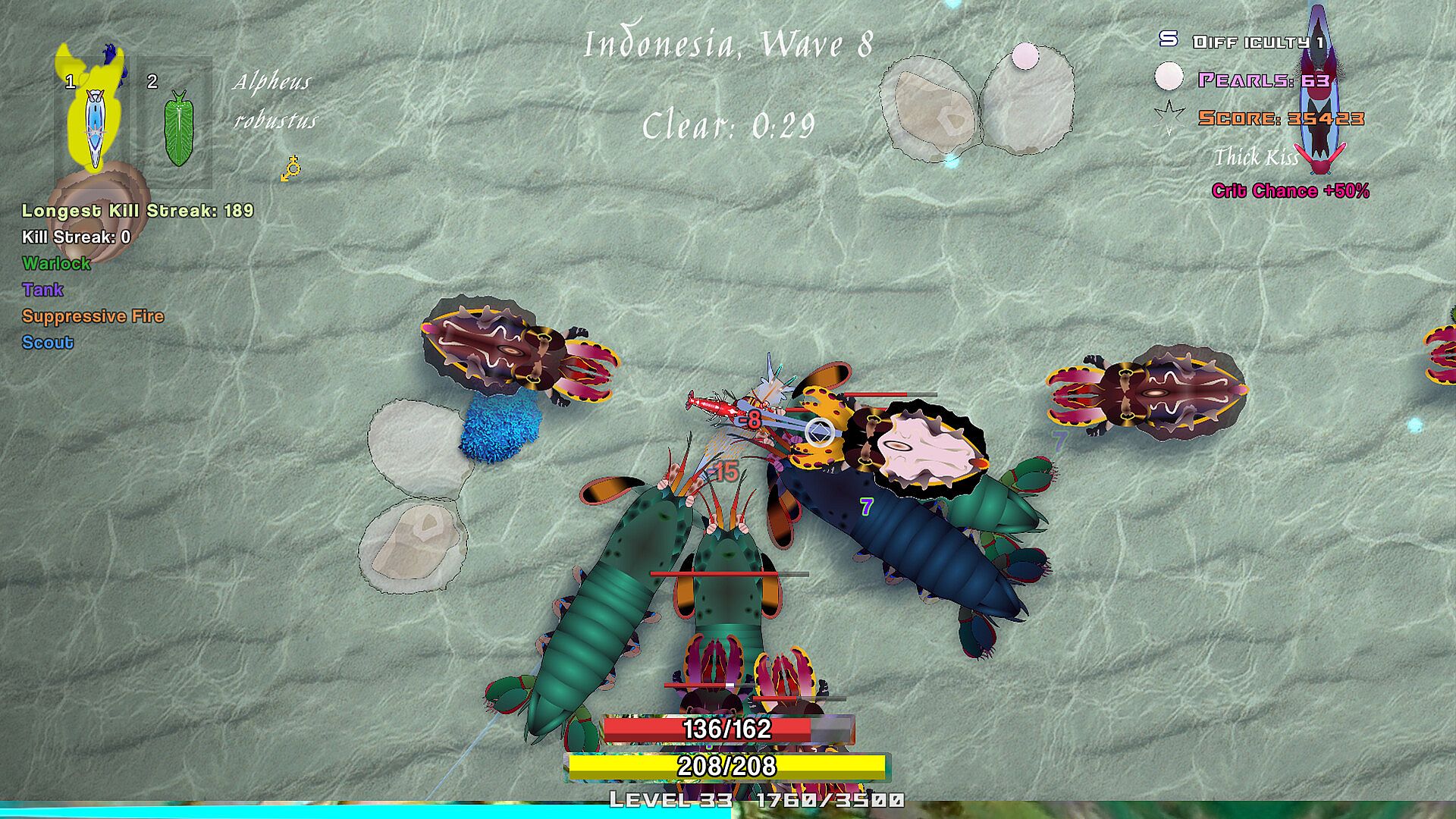 You will gain experience points to level up your crustacean and choose upgrades such as attack damage or movement speed. Crack open oysters to collect pearls to spend unlocking new shrimps and weapons after your run!
