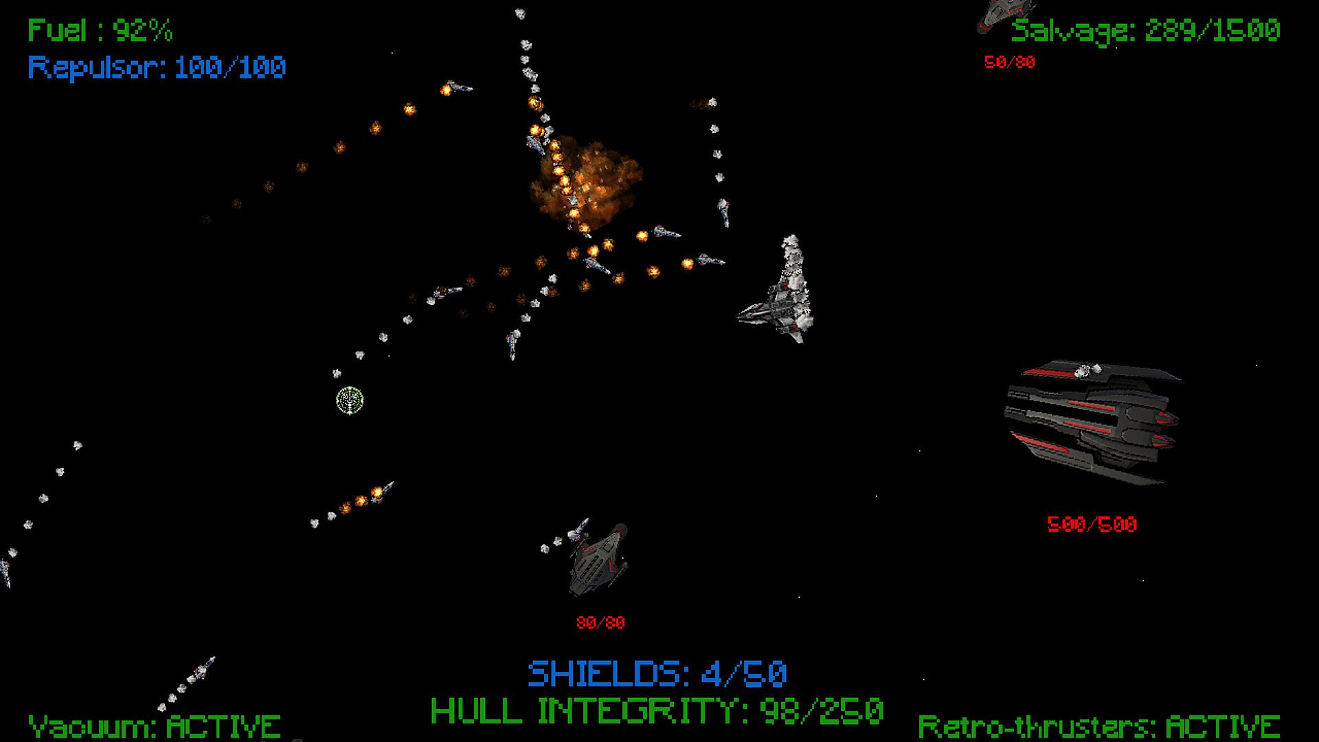 Salvager is a fast-paced top-down arcade shooter. You play as the pilot of the scavenger ship 'The Salvager', with no recollection of what came before, guided by an AI assistant towards one goal - planetary annihilation... Start small and fragile, carving your way through drifting asteroids and scavenging scrap from defeated enemies to repair and upgrade your vessel.