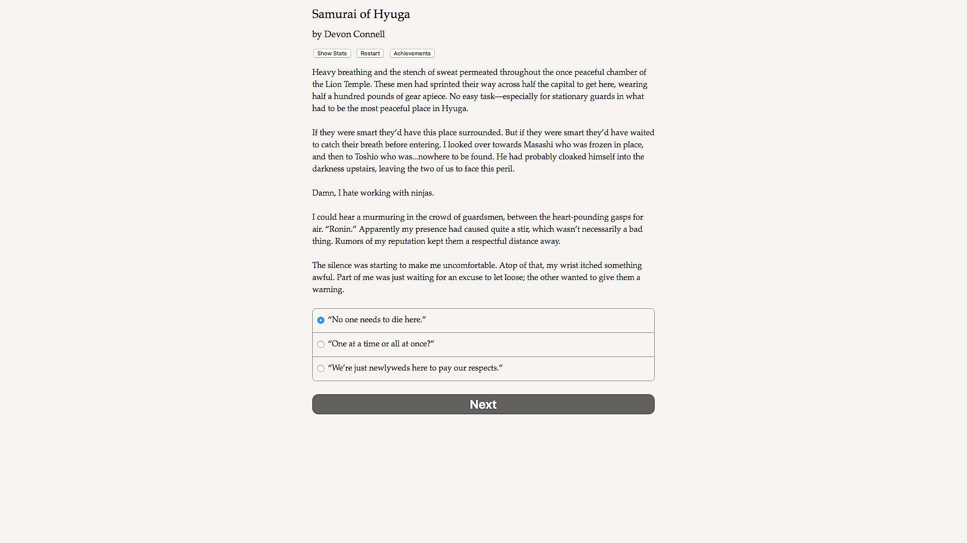 "Samurai of Hyuga" is a 135,000-word interactive fantasy novel by Devon Connell, where your choices control the story. It's entirely text-based--without graphics or sound effects--and fueled by the vast, unstoppable power of your imagination.