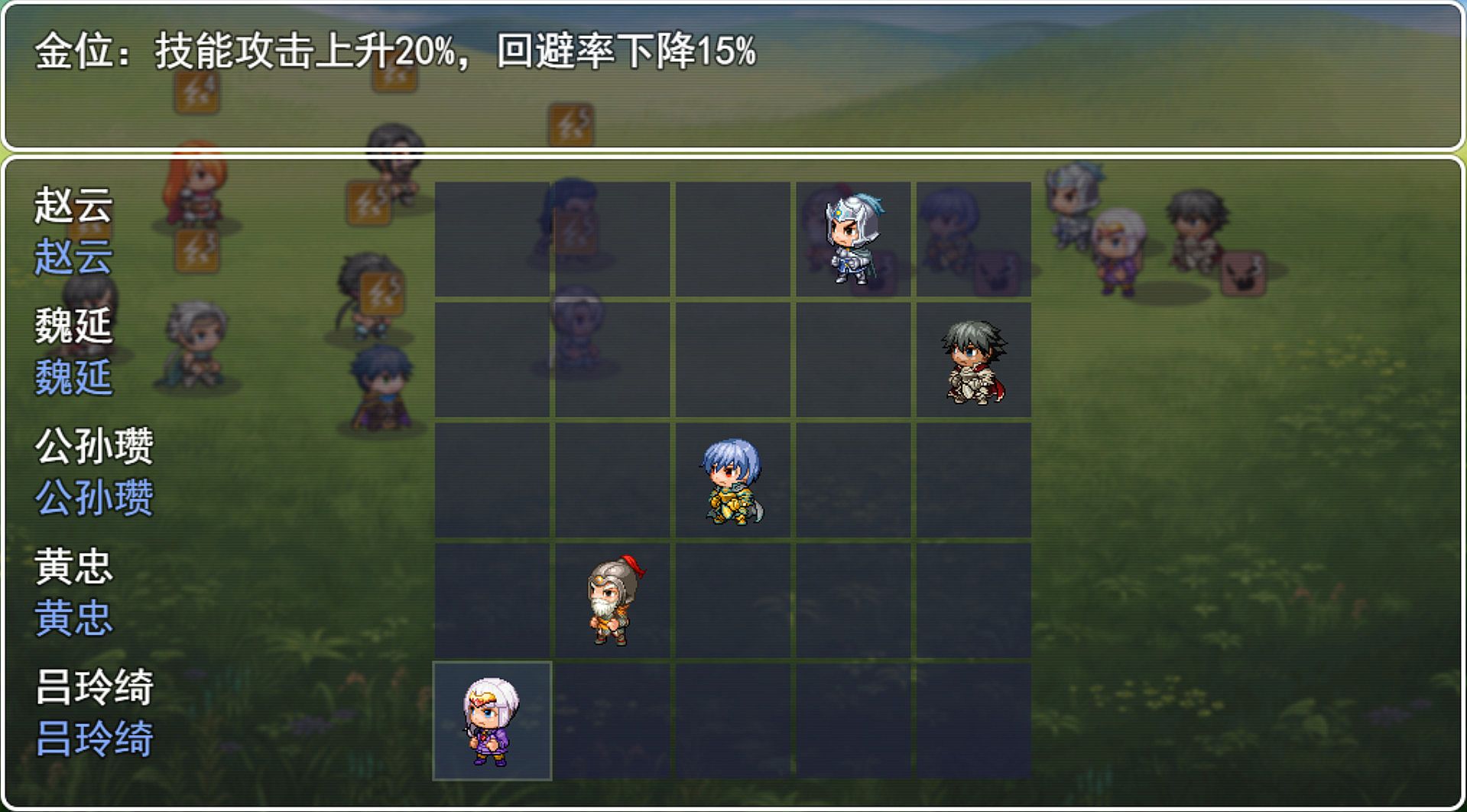 During the battle you should use Formation Menu to change the generals whose HP are low, to protect your Key officers. If a general's HP decrease to 0,and not revive before the end of the battle, he will die after the battle! You can use items or skills to revive a general to avoid his death. The death of protagonist will cause Game Over, so protect yourself!
